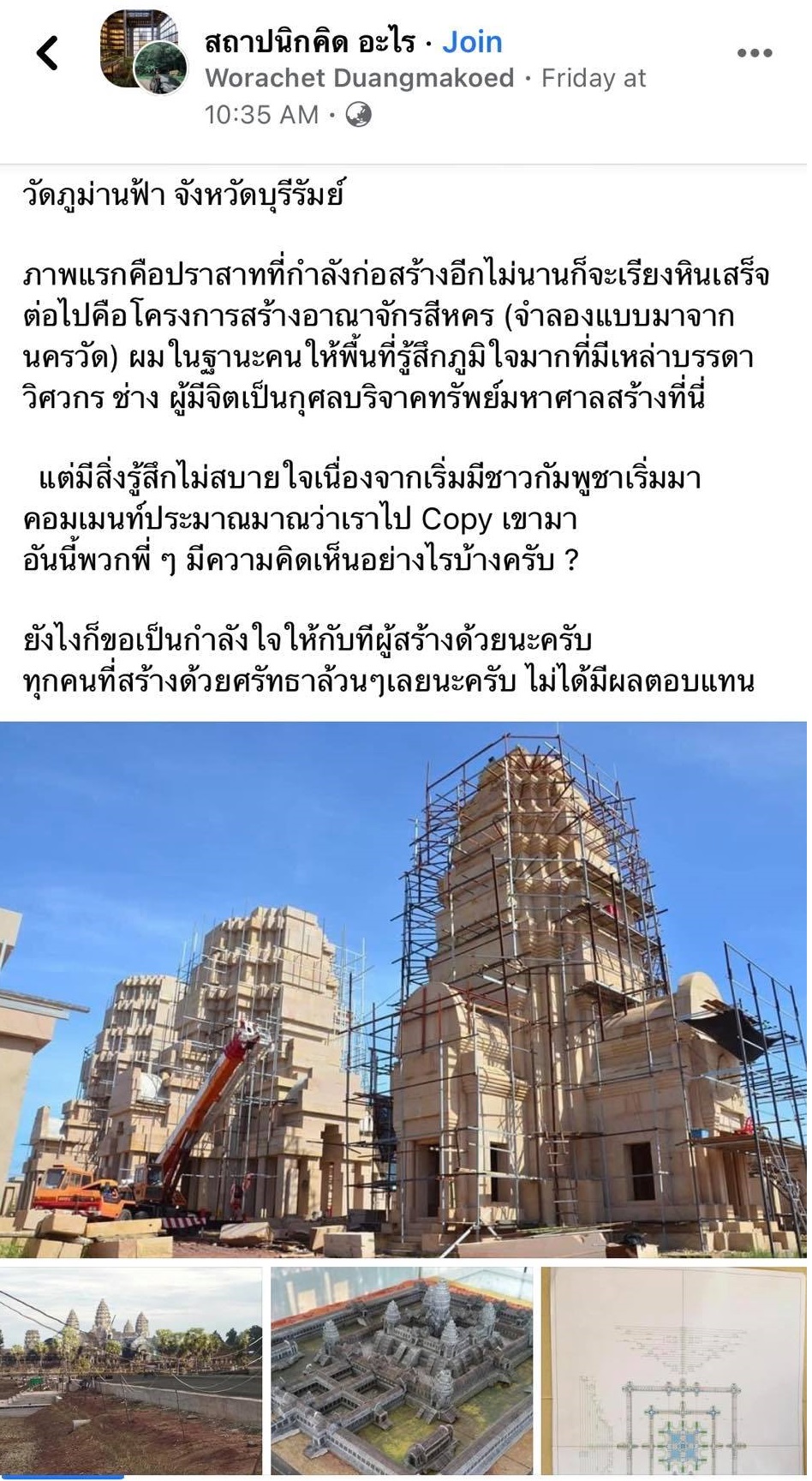 កាលពីពេលថ្មីៗនេះមានអ្នកលេងបណ្ដាញសង្គមហ្វេសប៊ុកជាច្រើននាក់ បានសម្ដែងនូវការភ្ញាក់ផ្អើលយ៉ាងខ្លាំង បន្ទាប់ពីគណនីជនជាតិថៃម្នាក់ឈ្មោះថា Worachet Duangmakoed បានបង្ហោះរូបភាពមួយចំនួន ដែលបង្ហាញពីគម្រោងនៃការសាងសង់ប្រាសាទមួយនៅលើទឹកដីខេត្តបូរីរ៉ាមរបស់ប្រទេសថៃ មានលក្ខណៈស្រដៀងគ្នានឹងប្រាសាទអង្គវត្តរបស់ប្រទេសកម្ពុជា ។ រូបភាពទាំងនោះត្រូវបានបង្ហោះឡើងកាលពីថ្ងៃសុក្រ ទី០២ ខែកក្កដា ឆ្នាំ២០២១ កន្លងទៅថ្មីៗនេះ ដោយនៅក្នុងនោះរួមមានទាំងប្លង់ និងគំរូសម្រាប់ការសាងសង់ផងដែរ។