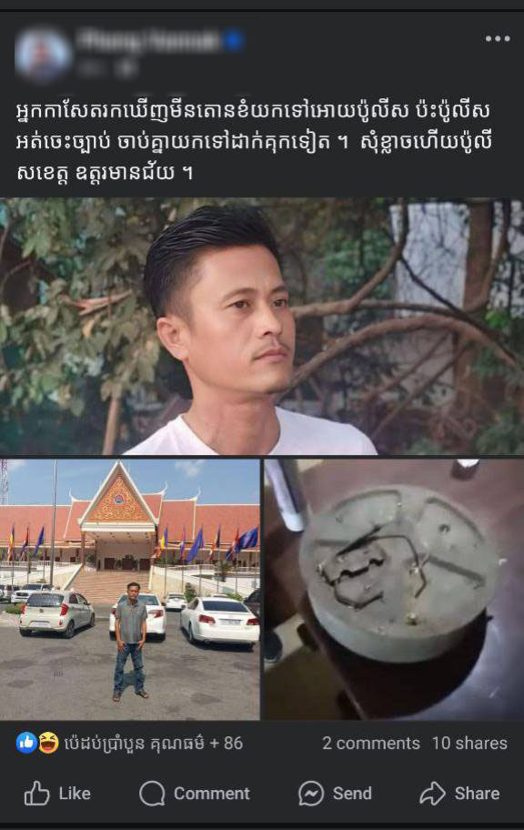 ដើម្បីកុំឲ្យមានការភាន់ច្រឡំ ស្នងការដ្ឋាននគរបាលខេត្ត បានធ្វើការបំភ្លឺជូនថា នៅថ្ងៃទី៦ ខែកុម្ភៈ ឆ្នាំ២០២៥ នៅចំណុចភូមិអូរស្មាច់ សង្កាត់អូរស្មាច់ ក្រុងសំរោង មានករណីលួចយកមីនតោនពីតំបន់ស ដែលអាជ្ញាធរទំនាក់ទំនងព្រំដែនប្រទេសទាំងពីរ កម្ពុជា-ថៃ ចាត់ទុកជាតំបន់ហាមឃាត់ បង្កឡើងដោយជនសង្ស័យចំនួន២នាក់ គឺឈ្មោះ ទឺ ពិទូ អាយុ៤៥ឆ្នាំ មុខរបរអ្នកសារព័ត៌មាន មានទីលំនៅភូមិចំការ ចេក សង្កាត់អូរស្មាច់ ក្រុងសំរោង និងឈ្មោះ ពែក ពុយ អាយុ៤៤ឆ្នាំ មានទីលំនៅភូមិគិរីមង្គល សង្កាត់អូរស្មាច់ ក្រុងសំរោង ខេត្តឧត្តរមានជ័យ។