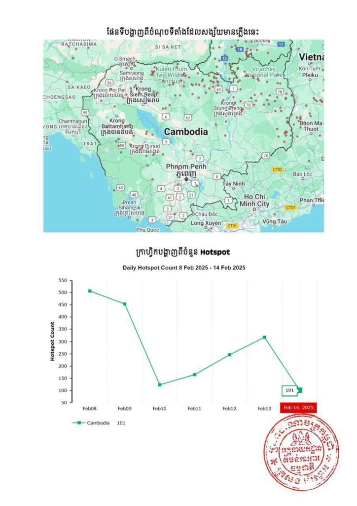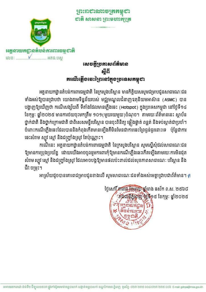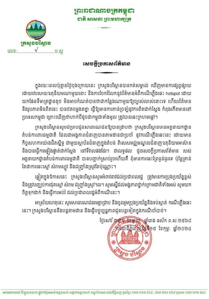 ក្រសួងបរិស្ថាន សូមជម្រាបជូនសាធារណជនឱ្យបានជ្រាបថា ក្រសួងបរិស្ថានមានអគ្គនាយកដា្ឋនតំបន់ការពារធម្មជាតិ ដែលជាអង្គភាពជំនាញបានតាមដានជាប្រចាំ នូវករណីភ្លើងឆេះនេះ ដោយមានកិច្ចសហការយ៉ាងជិតស្និទ្ធ ជាមួយស្ថាប័នជំនាញក្នុងតំបន់ ពិសេសមជ្ឈមណ្ឌលជំនាញឧតុនិយមអាស៊ាន និងបានធ្វើការផ្ទៀងផ្ទាត់ជាក់ស្តែង នៅទីវាលផងដែរ។ ជាលទ្ធផល ដូចសេចក្តីប្រកាសព័ត៌មាន របស់អគ្គនាយកដ្ឋានតំបន់ការពារធម្មជាតិ បានបញ្ជាក់ស្រាប់រួចហើយគឺ ពុំមានកានឆេះព្រៃធ្ងន់ធ្ងរទេ ប៉ុន្តែគ្រាន់តែជាការឆេះស្មៅ សំរាមស្បូវ និងជញ្ជាំងស្រូវតែប៉ុណ្ណោះ។