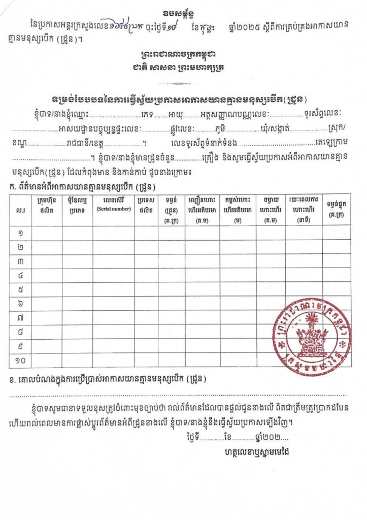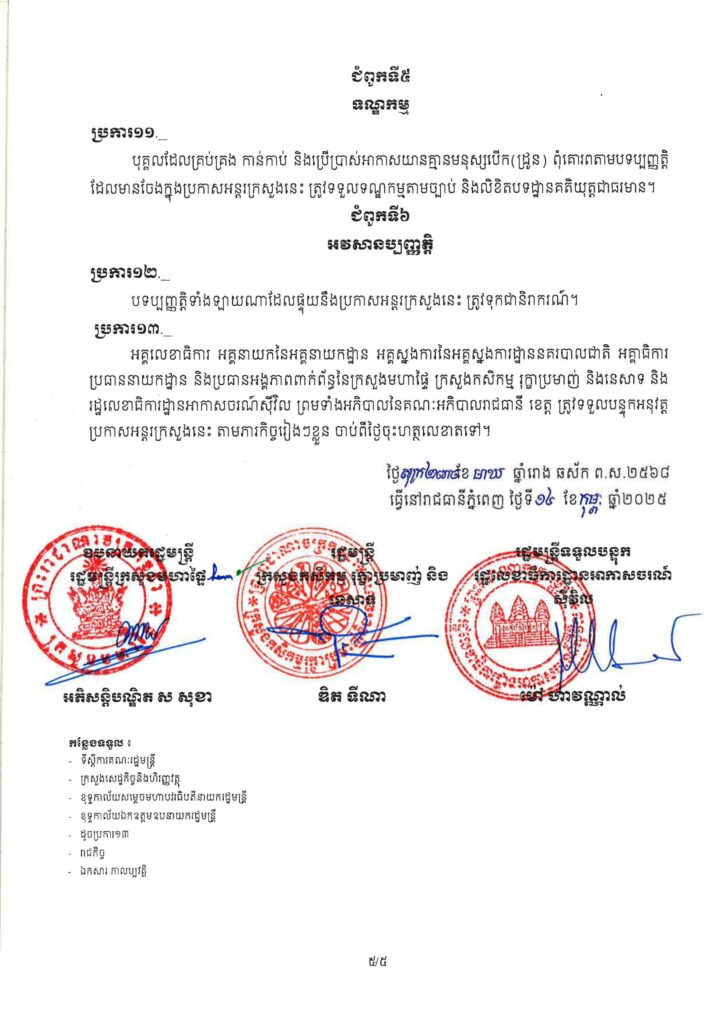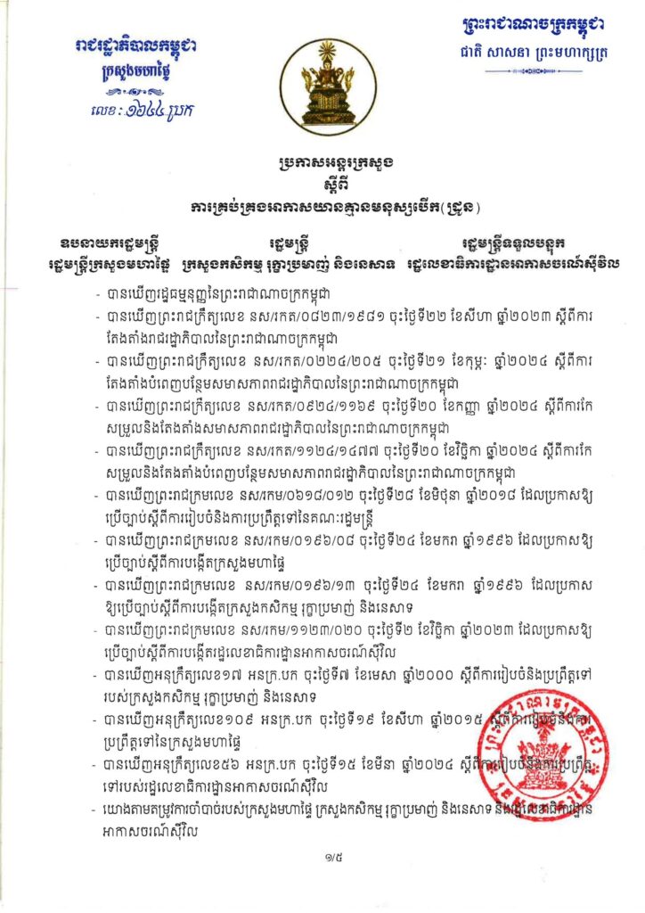 (ភ្នំពេញ)៖ ក្រសួងមហាផ្ទៃ ក្រសួងកសិកម្ម រុក្ខាប្រមាញ់និងនេសាទ និងរដ្ឋលេខាធិការដ្ឋានអាកាសចរណ៍ស៊ីវិល បានចេញប្រកាសអន្តរក្រសួង ស្តីពីការគ្រប់គ្រងអាកាសយាន គ្មានមនុស្សបើក (ដ្រូន)។ នេះបើតាមប្រកាសអន្តរក្រសួងដែលបណ្តាញព័ត៌មាន ទទួលបាននៅថ្ងៃទី១៥ ខែកុម្ភៈ ឆ្នាំ២០២៥នេះ។