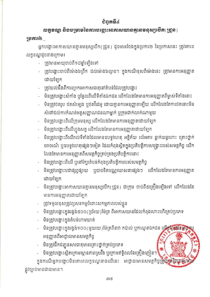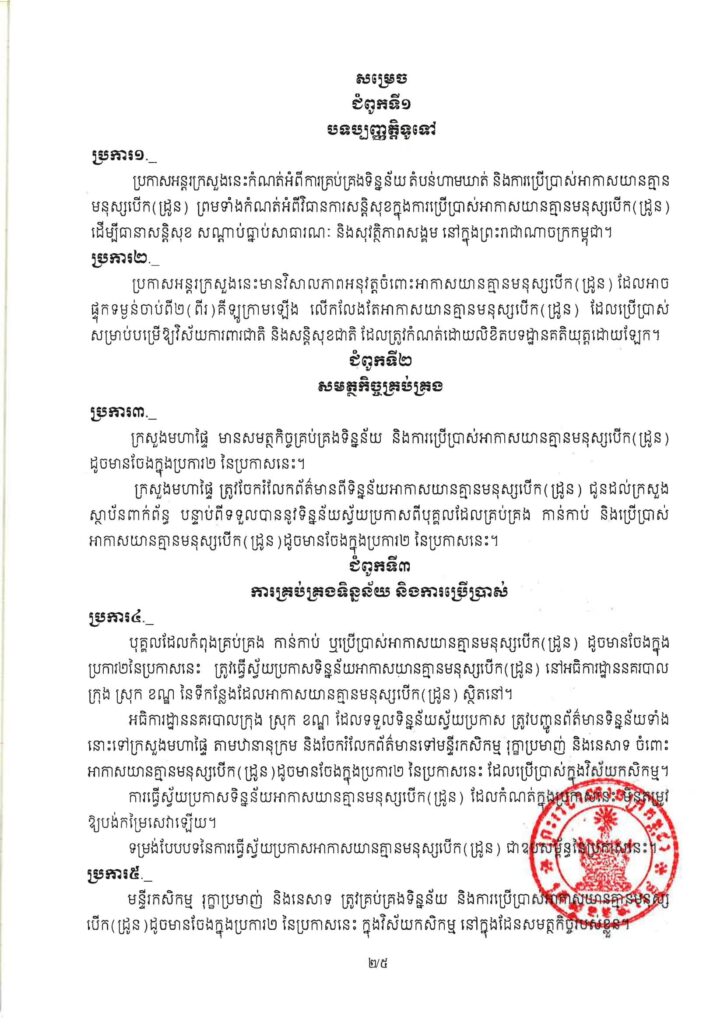 តាមប្រការ១ របស់ប្រកាសអន្តរក្រសួងនេះកំណត់អំពីការគ្រប់គ្រងទិន្នន័យ តំបន់ហាមឃាត់ និងការប្រើប្រាស់អាកាសយានគ្មាន មនុស្សបើក (ដ្រូន) ព្រមទាំងកំណត់អំពីវិធានការសន្តិសុខ ក្នុងការប្រើប្រាស់អាកាសយានគ្មានមនុស្សបើក (ដ្រូន) ដើម្បីធានាសន្តិសុខ សណ្តាប់ធ្នាប់សាធារណៈ និងសុវត្ថិភាពសង្គម នៅក្នុងព្រះរាជាណាចក្រកម្ពុជា។
