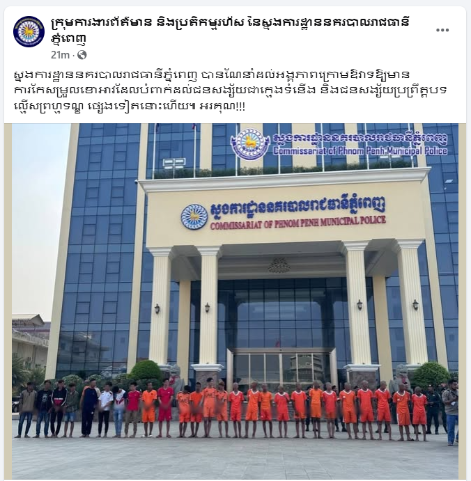 ស្នងការដ្ឋាននគរបាលរាជធានីភ្នំពេញ បានណែនាំដល់អង្គភាពក្រោមឱវាទឱ្យមានការកែសម្រួលខោអាវដែលបំពាក់ដល់ជនសង្ស័យជាក្មេងទំនើង និងជនសង្ស័យប្រព្រឹត្តបទល្មើសព្រហ្មទណ្ឌ ផ្សេងទៀតនោះហើយ។ នេះបើយោងតាមការចុះផ្សាយរបស់ ក្រុមការងារព័ត៌មាន និងប្រតិកម្មរហ័ស នៃស្នងការដ្ឋាននគរបាលរាជធានីភ្នំពេញ នាព្រឹកថ្ងៃទី២០ ខែកុម្ភៈ ឆ្នាំ២០២៥ នេះ។