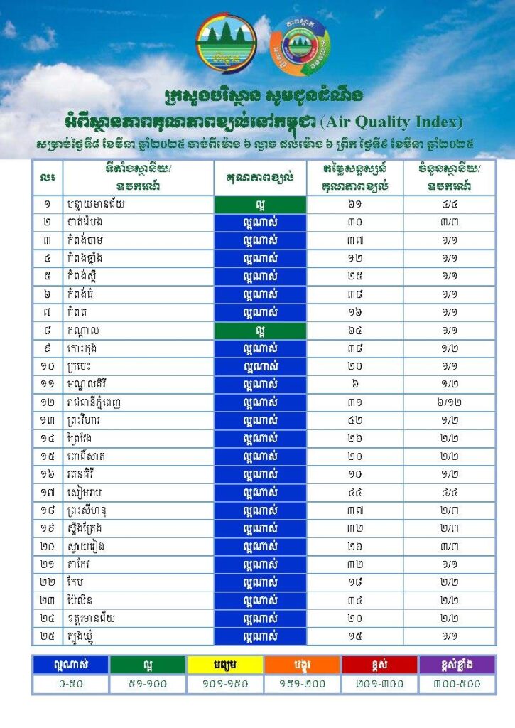 ពណ៌ខៀវៈ គុណភាពខ្យល់ល្អណាស់មានខេត្តបាត់ដំបង ខេត្តកំពង់ឆ្នាំង ខេត្តព្រៃវែង ខេត្តកែប ខេត្តក្រចេះ ខេត្តមណ្ឌលគីរី ខេត្តត្បូងឃ្មុំ ខេត្តកំពត ខេត្តកំពង់ចាម ខេត្តស្វាយរៀង ខេត្តព្រះសីហនុ ខេត្តកំពង់ធំ ខេត្តកំពង់ស្ពឺ ខេត្តកោះកុង ខេត្តពោធិ៍សាត់ ខេត្តព្រះវិហារ រាជធានីភ្នំពេញ ខេត្តប៉ៃលិន ខេត្តស្ទឹងត្រែង ខេត្តរតនគិរី ខេត្តតាកែវ ខេត្តសៀមរាប និងខេត្តឧត្តរមានជ័យ, ពណ៌បៃតងៈ គុណភាពខ្យល់ល្អមាន ខេត្តបន្ទាយមានជ័យ និងខេត្តកណ្តាល៕ ផ្ដល់សិទ្ធិដោយ៖ Freshnews