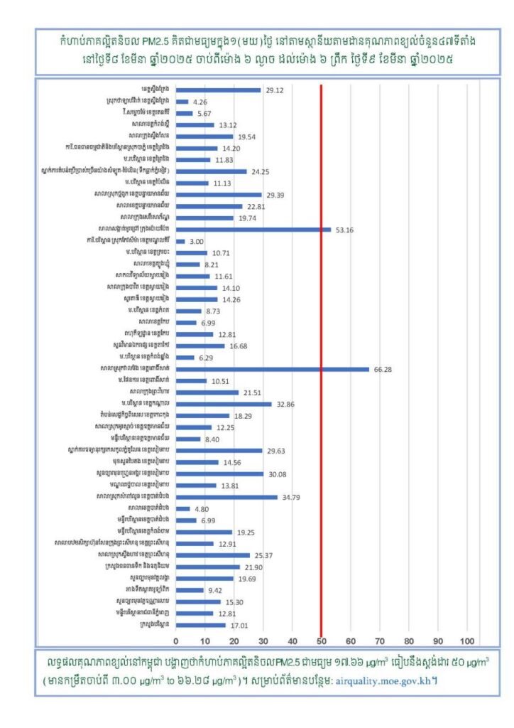 (ភ្នំពេញ)៖ ក្រសួងបរិស្ថាន ជូនដំណឹងអំពីស្ថានភាពគុណភាពខ្យល់ នៅក្នុងព្រះរាជាណាចក្រកម្ពុជា សម្រាប់ថ្ងៃទី៨ ខែមីនា ឆ្នាំ២០២៥ ចាប់ពីម៉ោង ៦ល្ងាច ដល់ម៉ោង ៦ព្រឹកថ្ងៃទី៩ ខែមីនា ឆ្នាំ២០២៥ ដែលមានកំហាប់ភាគល្អិតនិចលគិតជាមធ្យមស្មើនឹង១៧.៦៦ µg/m3 ធៀបនឹងស្តង់ដារ ៥០ ug/m3 និងគិតជាសន្ទស្សន៍គុណភាពខ្យល់ (Air Quality Index) គឺ «ល្អណាស់»។