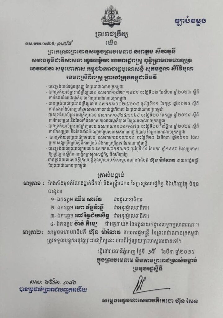 (ភ្នំពេញ)៖ ព្រះករុណា ព្រះបាទ សម្ដេច ព្រះបរមនាថ នរោត្តម សីហមុនី ព្រះមហាក្សត្រនៃកម្ពុជា ទ្រង់បានចេញព្រះរាជក្រឹត្យត្រាស់បង្គាប់តែងតាំង រដ្ឋលេខាធិការ អនុរដ្ឋលេខាធិការ និងអគ្គនាយក នៃអគ្គនាយកដ្ឋានលទ្ធកម្មសាធារណៈក្រសួងសេដ្ឋកិច្ច និងហិរញ្ញវត្ថុចំនួន៤រូប។ នេះបើតាមព្រះរាជក្រឹត្យដែលបណ្តាញព័ត៌មាន ទទួលបាននៅថ្ងៃទី១៥ ខែមីនា ឆ្នាំ២០២៥នេះ។