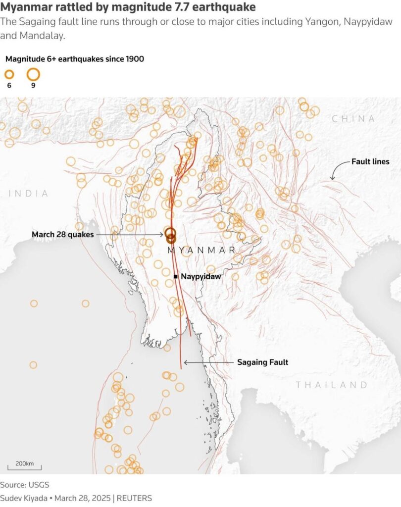 គ្រោះរញ្ជួយដីកម្រិត ៧.៧រ៉ិចទ័រ បានវាយប្រហារលើភាពពាយព្យនៃទីក្រុង Sagaing នៅភាគកណ្ដាលនៃប្រទេសមីយ៉ាន់ម៉ា កាលពីថ្ងៃសុក្រ ទី២៨ ខែមីនា ហើយក៏បង្កផលប៉ះពាល់ដល់ប្រទេស ក្បែរខាងដូចជាថៃផងដែរ។ តាមរដ្ឋាភិបាលយោធាមីយ៉ាន់ម៉ា មនុស្សយ៉ាងហោច ១៦៤៤នាក់បានស្លាប់ ខណៈនៅទីក្រុងបាងកក មានអ្នកស្លាប់ ១០នាក់ ដោយសារគ្រោះរញ្ជួយដីនេះ។