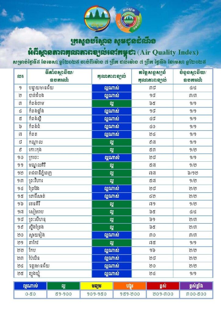 ពណ៌ខៀវៈ គុណភាពខ្យល់ល្អណាស់មានខេត្តបន្ទាយមានជ័យ ខេត្តបាត់ដំបង ខេត្តកំពង់ឆ្នាំង ខេត្តកំពត ខេត្តក្រចេះ ខេត្តស្វាយរៀង ខេត្តកែប ខេត្តត្បូងឃ្មុំ ខេត្តឧត្តរមានជ័យ ខេត្តកំពង់ស្ពឺ ខេត្តកំពង់ធំ ខេត្តពោធិ៍សាត់ ខេត្តព្រៃវែង និងខេត្តប៉ៃលិន, ពណ៌បៃតងៈ គុណភាពខ្យល់ល្អមាន ខេត្តកំពង់ចាម ខេត្តកណ្តាល ខេត្តកោះកុង ខេត្តមណ្ឌលគីរី រាជធានីភ្នំពេញ ខេត្តព្រះវិហារ ខេត្តរតនគិរី ខេត្តតាកែវ ខេត្តព្រះសីហនុ ខេត្តស្ទឹងត្រែង និង ខេត្តសៀមរាប៕ ផ្ដល់សិទ្ធិដោយ៖ Freshnews