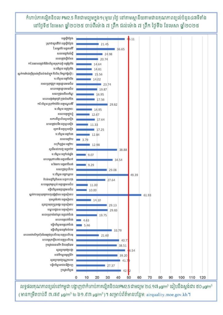 (ភ្នំពេញ)៖ ក្រសួងបរិស្ថាន ជូនដំណឹងអំពីស្ថានភាពគុណភាពខ្យល់នៅក្នុងព្រះរាជាណាចក្រកម្ពុជា សម្រាប់ថ្ងៃទី៥ ខែមេសា ឆ្នាំ២០២៥ ចាប់ពីម៉ោង ៧ព្រឹក ដល់ម៉ោង ៧ព្រឹក ថ្ងៃទី៦ ខែមេសា ឆ្នាំ២០២៥ ដែលមានកំហាប់ភាគល្អិតនិចលគិតជាមធ្យមស្មើនឹង២៤.១៧ µg/m3 ធៀបនឹងស្តង់ដារ ៥០ ug/m3 និងគិតជាសន្ទស្សន៍គុណភាពខ្យល់ (Air Quality Index) គឺ «ល្អណាស់»។