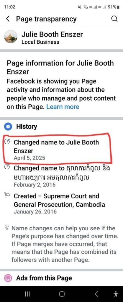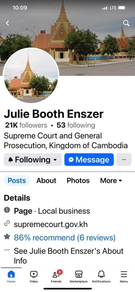(ភ្នំពេញ)៖ ទំព័រហ្វេសប៊ុកផ្លូវការរបស់តុលាការកំពូល និងមហាអយ្យការអមតុលាការកំពូល ដែលមានឈ្មោះថា «តុលាការកំពូល និងមហាអយ្យការអមតុលាការកំពូល» ត្រូវបាន Hack យកទៅគ្រប់គ្រងហើយ នៅថ្ងៃទី០៦ ខែមេសា ឆ្នាំ២០២៥នេះ។