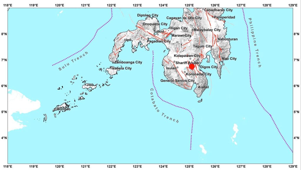 វិទ្យាស្ថានបានបញ្ជាក់ថា ចំណុចរំញ័រនៃគ្រោះរញ្ជួយដីនេះ បានកើតឡើងនៅជម្រៅ ១១៧ គីឡូម៉ែត្រ ហើយមានទីតាំងប្រហែល ២៩៥ គីឡូម៉ែត្រ ភាគអាគ្នេយ៍នៃកោះ Sarangani។ ការរញ្ជួយនេះក៏ត្រូវបានទទួលអារម្មណ៍នៅក្នុងទីក្រុង Santos និងខេត្ត Sarangani, South Cotabato និង Sultan Kudarat ផងដែរ។