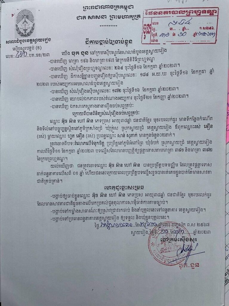 លោកវរសេនីយ៍ឯក សោម សុភ័ណ្ឌ អធិការនគរបាលស្រុកស្វាយជ្រំ បានឲ្យដឹងថា នៅថ្ងៃទី២៦ ខែមេសា ឆ្នាំ២០២៥ វេលាម៉ោង៩ និង៣០ នាទីព្រឹក លោកវរសេនីយ៍ឯក គឹម ឡៃ ស្នងការរង បានដឹកនាំកម្លាំងជំនាញខេត្ត ចុះមកសហការជាមួយ លោកវរសេនីយ៍ឯក សោម សុភ័ណ្ឌ អធិការនគរបាលស្រុកស្វាយជ្រំ និងកម្លាំងនៃអធិការដ្ឋាននគរបាលស្រុកស្វាយជ្រំ ព្រមទាំងបានសហការជាមួយកម្លាំងសមត្ថកិច្ចពាក់ព័ន្ធ ចុះអនុវត្តតាមដីកាបង្គាប់ឲ្យចាប់ខ្លួនលេខ៥៤៧ ចុះថ្ងៃទី១០ ខែតុលាឆ្នាំ២០២៣ ចេញដោយលោក ចុក ងួន ចៅក្រមស៊ើបសួរសាលាដំបូងខេត្តស្វាយរៀង ឱ្យចាប់ខ្លួនឈ្មោះ អ៊ុច អ៊ាន ភេទប្រុស អាយុ៤០ឆ្នាំ ជនជាតិខ្មែរមុខរបរមិនពិតប្រាកដ មានទីលំនៅភូមិក្រសាំងជ្រំ ឃុំគ្រួស ស្រុកស្វាយជ្រំ ខេត្តស្វាយរៀង ពីបទរំលោភលើទំនុកចិត្ត ប្រព្រឹត្តនៅចំណុចភូមិអំពៅព្រៃ ឃុំចំបក់ ស្រុកស្វាយជ្រំ ខេត្តស្វាយរៀង កាលពីថ្ងៃទី១១ ខែកក្កដាឆ្នាំ២០២៣។