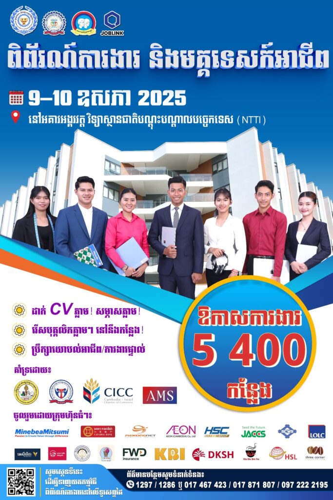 (ភ្នំពេញ)៖ ភ្នាក់ងារជាតិមុខរបរ និងការងារ (NEA) នៃក្រសួងការងារ និងបណ្តុះបណ្តាលវិជ្ជាជីវៈ បានសហការជាមួយសហភាពសហព័ន្ធយុវជនកម្ពុជា (ស.ស.យ.ក) រាជធានីភ្នំពេញ និងសភាពាណិជ្ជកម្មកម្ពុជា-អ៊ីស្រាអែល នឹងរៀបចំ «ពិព័រណ៍ការងារ និងមគ្គទេសក៍អាជីព ឆ្នាំ២០២៥» ដែលនឹងប្រព្រឹត្តទៅរយៈពេល ២ថ្ងៃ គឺចាប់ពីថ្ងៃទី៩-១០ ខែឧសភា ឆ្នាំ២០២៥ វេលាម៉ោង ៨៖០០នាទីព្រឹក ដល់ម៉ោង ១៧៖០០នាទីល្ងាច នៅអគារ អង្គរវត្ត នៃវិទ្យាស្ថានជាតិបណ្តុះបណ្តាលបច្ចេកទេស (NTTI)។