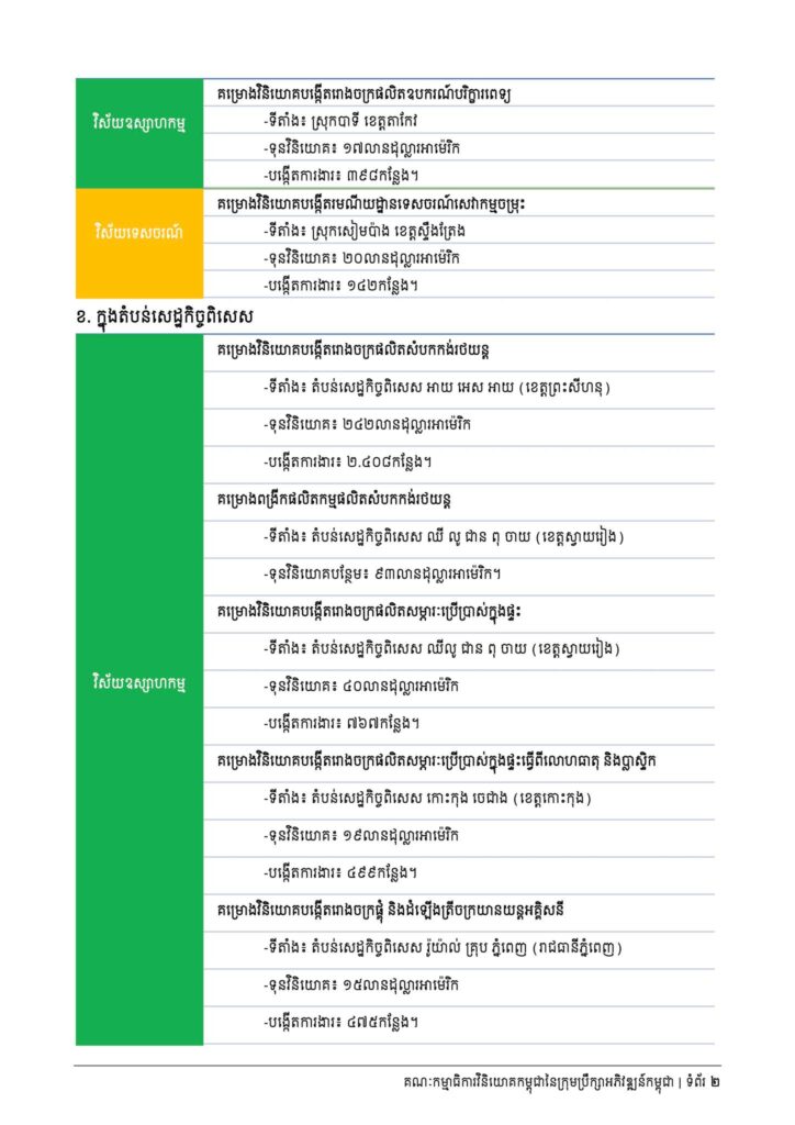 ក្នុងចំណោមគម្រោងវិនិយោគសរុប គម្រោងវិនិយោគដែលមានទីតាំងស្ថិតនៅក្រៅតំបន់សេដ្ឋកិច្ច ពិសេសមានចំនួន៣២គម្រោង និងគម្រោងវិនិយោគ ដែលមានទីតាំងស្ថិតនៅក្នុងតំបន់សេដ្ឋកិច្ចពិសេសមាន ចំនួន២៧គម្រោង។