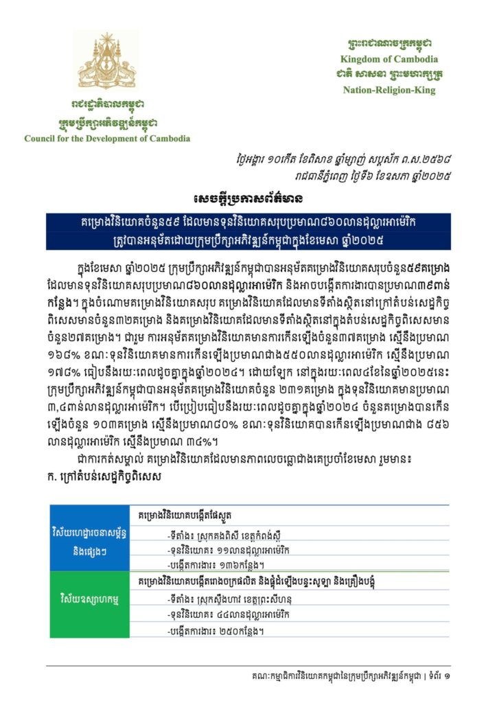 សេចក្ដីប្រកាសព័ត៌មាន បានបញ្ជាក់ថា ក្នុងខែមេសា ឆ្នាំ២០២៥ ក្រុមប្រឹក្សាអភិវឌ្ឍន៍កម្ពុជា បានអនុម័តគម្រោងវិនិយោគសរុបចំនួន៥៩គម្រោង ដែលមានទុនវិនិយោគសរុប ប្រមាណ៨៦០លានដុល្លារអាម៉េរិក និងអាចបង្កើតការងារបានប្រមាណ៣៩ពាន់ កន្លែង។