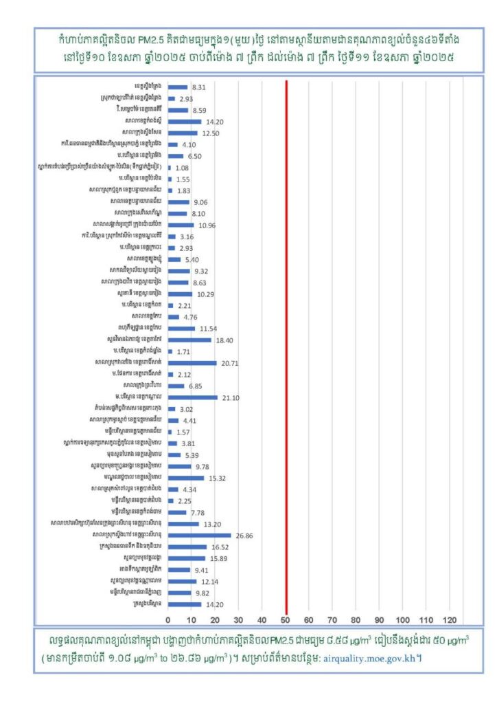 (ភ្នំពេញ)៖ ក្រសួងបរិស្ថាន ជូនដំណឹងអំពីស្ថានភាពគុណភាពខ្យល់នៅក្នុងព្រះរាជាណាចក្រកម្ពុជា សម្រាប់ថ្ងៃទី១០ ខែឧសភា ឆ្នាំ២០២៥ ចាប់ពីម៉ោង ៧ព្រឹក ដល់ម៉ោង ៧ព្រឹក ថ្ងៃទី១១ ខែឧសភា ឆ្នាំ២០២៥ ដែលមានកំហាប់ភាគល្អិតនិចលគិតជាមធ្យមស្មើនឹង៨.៥៨ µg/m3 ធៀបនឹងស្តង់ដារ ៥០ ug/m3 និងគិតជាសន្ទស្សន៍គុណភាពខ្យល់ (Air Quality Index) គឺ «ល្អណាស់»។