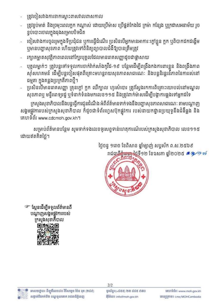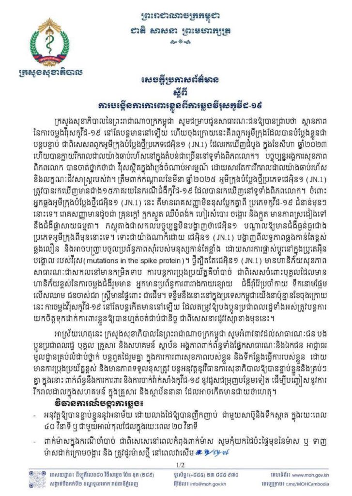 លោកស្រី ឱ​ វណ្ណឌីន បានលើកឡើងថា ដោយសារស្ថានភាពកើតមានការឆ្លងឡើងវិញនូវវីរុសកូវីដ-១៩​ បំប្លែងថ្មី​ ពិសេសពួក​ ជេអ៉ិន.១​ (JN.1) ដែលកំពុងតែចរាចរនៅតាមបណ្តាប្រទេសជិតខាងកម្ពុជា​ និងនៅតាមតំបន់នៅលើពិភពលោក​ ក្រសួងសុខាភិបាលបានចេញសេចក្តីប្រកាសព័ត៌មានរួចហើយ​ ស្តីពី «ការបង្កើនការការពារខ្លួន​ ពីការឆ្លងវីរុសកូវីដ-១៩» ចុះថ្ងៃទី១២​ ខែឧសភា​ ឆ្នាំ២០២៥​ (ជូនភ្ជាប់មកជាមួយខាងក្រោមនេះស្រាប់)។ ដូច្នេះ​សូមបងប្អូនប្រជាពលរដ្ឋទាំងអស់​ បង្កើនការយកចិត្តទុកដាក់​ និងប្រុងប្រយ័ត្នខ្ពស់​ ការពារខ្លួនពីការឆ្លងវីរុសកូវីដ-១៩​ ដែលអាចមានផលប៉ះពាល់សុខភាពដោយសារជំងឺកូវីដ-១៩​ ជាពិសេសជនដែលងាយរងគ្រោះ​ មានដូចជាជនវ័យចាស់​ ចាស់ជរា​ អ្នកដែលមានជំងឺរ៊ាំរ៊ៃ និងអ្នកដែលមានកងការពារខ្សោយនៅក្នុងខ្លួនជាដើម។