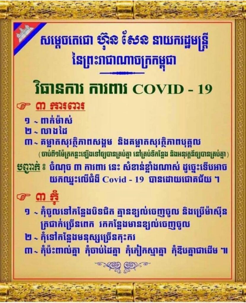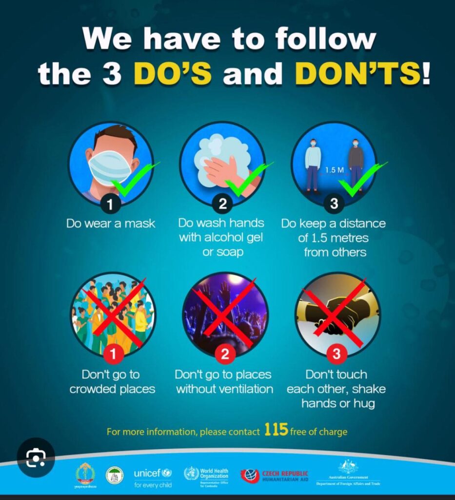 មន្ត្រីជាន់ខ្ពស់រូបនេះបន្ថែមថា សូមកុំភ្លេចវិធានការ​ ««៣​ ការពារ​ និង​ ៣​ កុំ»» រួមជាមួយនឹងការចាក់វ៉ាក់សាំងកូវីដ-១៩​ ទើបអាចជួយកាត់បន្ថយជាអតិប្បរិមា​ នូវភាពធ្ងន់ធ្ងរ​នៃជំងឺ​ការចូលសម្រាកពេទ្យ​ និងការស្លាប់​ ដូចដែលយើងទាំងអស់គ្នាឆ្លងកាត់បទពិសោធន៍ទទួលបានលទ្ធផលល្អទាំងនេះនៅឆ្នាំ២០២១​ដល់ឆ្នាំ២០២២​ ស្រាប់ហើយ។