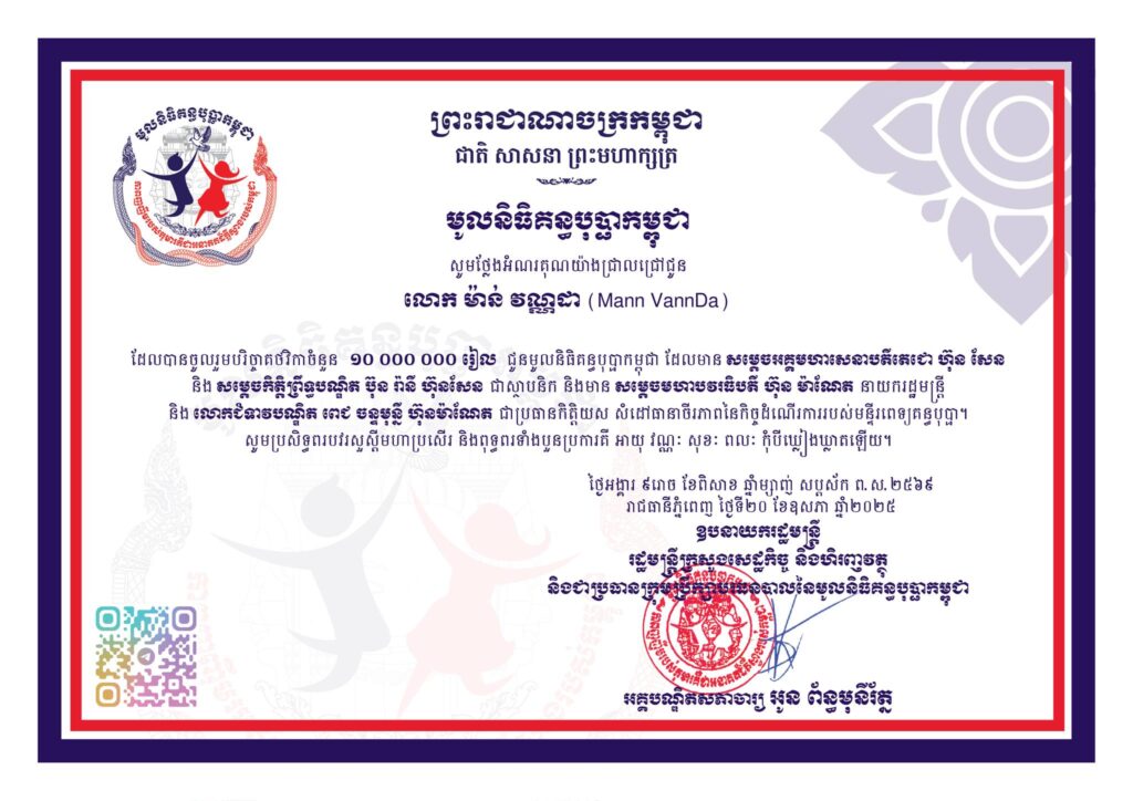 ជាមួយគ្នានេះដែរ ដើម្បីចូលរួមគាំទ្រ យុទ្ធនាការ “១ម៉ឺនរៀល ១ម៉ឺននាក់” ឆ្នាំ២០២៥, សូមបរិច្ចាគតាមរយៈលេខគណនីរបស់មូលនិធិនៅគ្រឹះស្ថានហិរញ្ញវត្ថុទាំង ១៦ ដែលជាដៃគូរ (ដូចមានក្នុងរូបភាពជូនភ្ជាប់) ឬតាមរយៈគណនីរបស់មូលនិធិគន្ធបុប្ផាកម្ពុជា នៅធនាគារអេស៊ីលីដា លេខ ០០០១-០៣៤១២៧៣៨១៣ សម្រាប់ប្រាក់រៀល និង ០០០១-០៣៤១២៧៣៨២៤ សម្រាប់ប្រាក់ដុល្លារអាម៉េរិក ឬតាមរយៈ QR Code ដូចមានក្នុងរូបភាពខាងក្រោម។