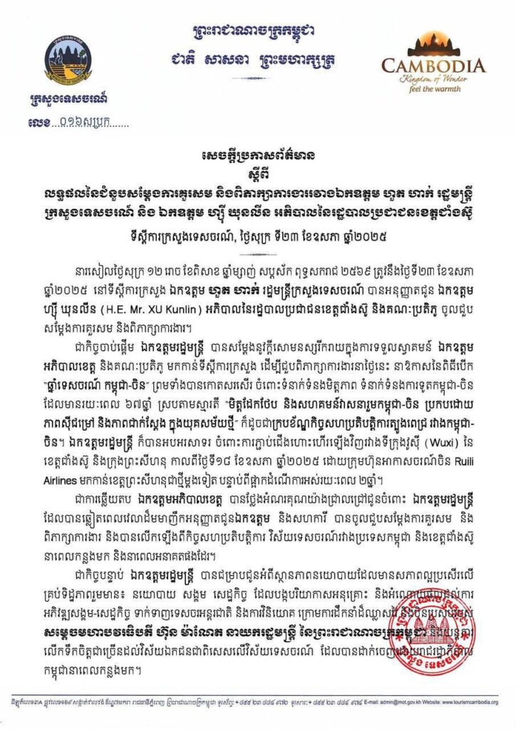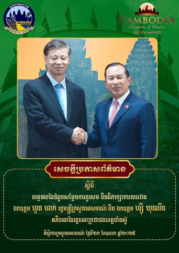 (ភ្នំពេញ)៖ ក្រសួងទេសចរណ៍ នៅថ្ងៃទី២៣ ខែឧសភា ឆ្នាំ២០២៥ បានចេញសេចក្ដីប្រកាសព័ត៌មានស្ដីពី លទ្ធផលនៃជំនួបសម្តែងការគួរសម និងពិភាក្សាការងាររវាងលោក ហួត ហាក់ រដ្ឋមន្ត្រីក្រសួងទេសចរណ៍ និង លោក ហ្ស៊ី ឃុនលីន អភិបាលនៃរដ្ឋបាលប្រជាជនខេត្តជាំងស៊ូ ទីស្តីការក្រសួងទេសចរណ៍ ថ្ងៃទី២៣ ខែឧសភា ឆ្នាំ២០២៥។