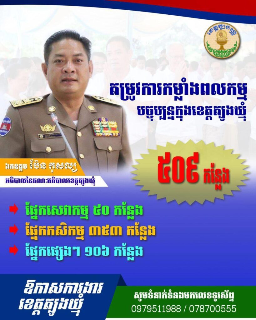 អភិបាលខេត្តត្បូងឃ្មុំ ប្រកាសពីការខ្វះកម្លាំងពលកម្មជាង៥០០នាក់ និងផ្ដល់លេខទំនាក់ទំនងសម្រាប់អ្នកមានចំណាប់អារម្មណ៍