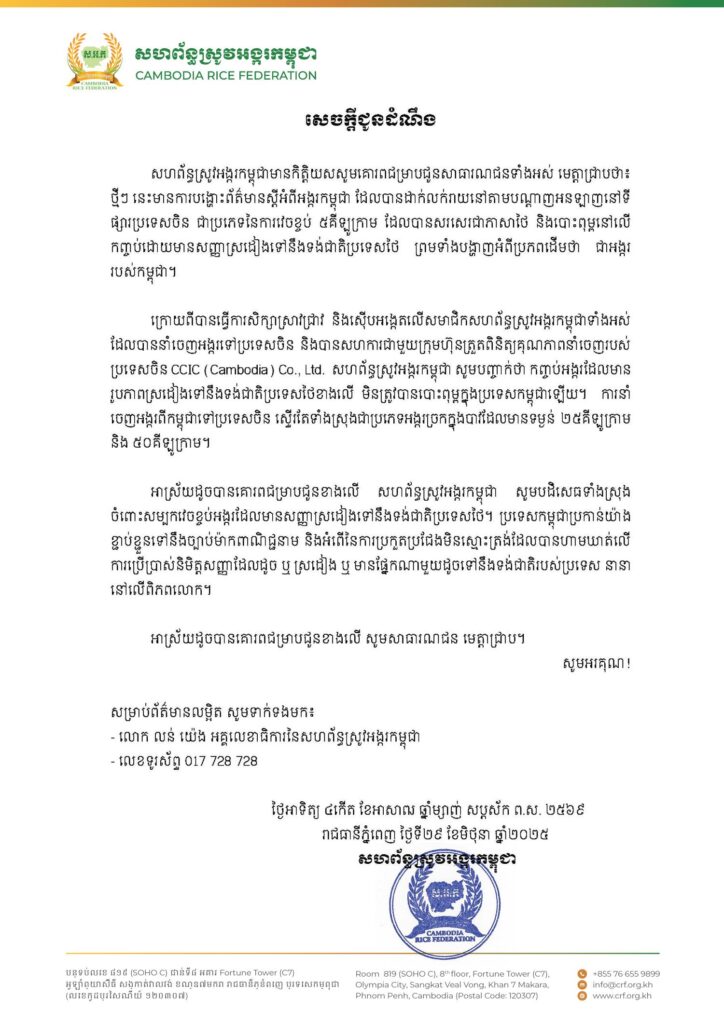 (ភ្នំពេញ)៖ សហព័ន្ធស្រូវអង្ករកម្ពុជា នៅថ្ងៃទី២៩ ខែមិថុនា ឆ្នាំ២០២៥នេះ ចេញសេចក្តីជូនដំណឹងមួយ ដោយបញ្ជាក់ឱ្យដឹងថា ថ្មីៗ នេះមានការបង្ហោះព័ត៌មាន ស្តីអំពីអង្ករកម្ពុជា ដែលបានដាក់លក់រាយនៅតាមបណ្តាញអនឡាញនៅទីផ្សារប្រទេសចិន ជាប្រភេទនៃការវេចខ្ចប់ ៥គីឡូក្រាម ដែលបានសរសេរជាភាសាថៃ និងបោះពុម្ពនៅលើកញ្ចប់ដោយមានសញ្ញាស្រដៀងទៅនឹងទង់ជាតិប្រទេសថៃ ព្រមទាំងបង្ហាញអំពីប្រភពដើមថា ជាអង្កររបស់កម្ពុជា។