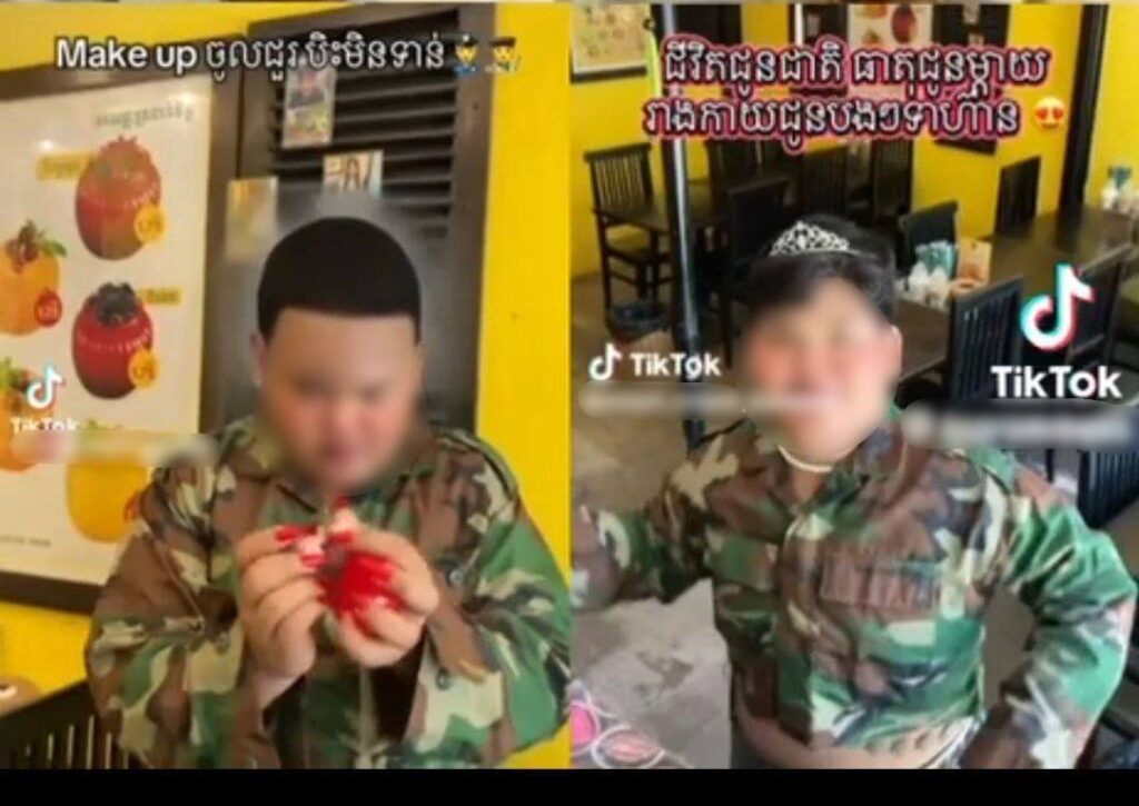 (សៀមរាប)៖ កាលពីពេលថ្មីៗនេះ មានយុវជនម្នាក់បានថតវីដេអូពាក់អាវប៉ារ៉ា (យោធា) សម្ដែង និងរាំ បង្ហោះក្នុងបណ្តាញសង្គមតិកតុក (TikTok) ចំនួនពីរឃ្លីប ដោយបានសរសេរខ្លឹមសារ «Make up ចូលជួរបិះមិនទាន់ជីវិតជូនជាតិធាតុជូនម្តាយ រាងកាយជូនបងៗទាហាន» លើគណនីតិកតុក (TikTok) របស់ខ្លួន ក្នុងគោលបំណងទាក់ទាញចំណាប់អារម្មណ៍ឱ្យមានគេចូលមកមើលគណនីតិកតុកហាងរបស់ខ្លួន។