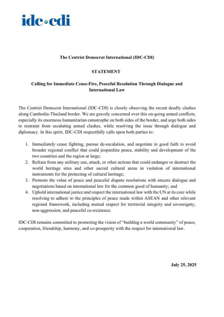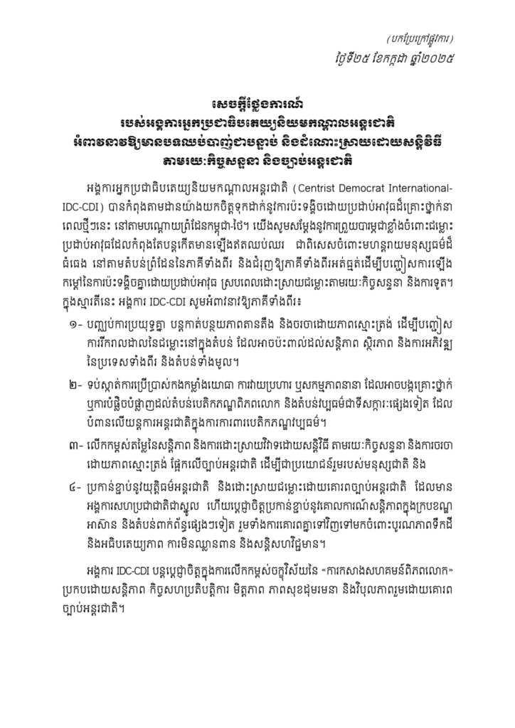 អង្គការអ្នកប្រជាធិបតេយ្យនិយមកណ្តាលអន្តរជាតិ ចេញសេចក្តីថ្លែងការណ៍អំពាវនាវឱ្យមានបទឈប់បា.ញ់ជាបន្ទាន់ និងដំណោះស្រាយដោយសន្តិវិធី តាមរយៈកិច្ចសន្ទនា និងច្បាប់អន្តរជាតិ សម្រាប់ជម្លោះព្រំដែនកម្ពុជា-ថៃ