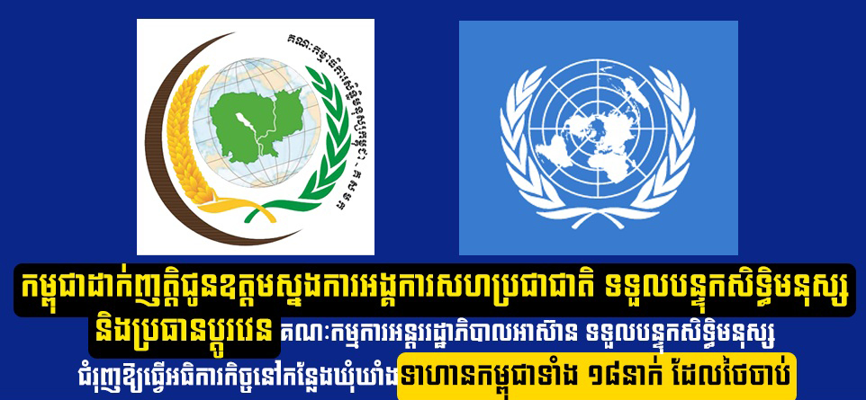 កម្ពុជាដាក់ញត្តិជូនឧត្តមស្នងការអង្គការសហប្រជាជាតិ ទទួលបន្ទុកសិទ្ធិមនុស្ស និងប្រធានប្តូរវេន គណៈកម្មការអន្តររដ្ឋាភិបាលអាស៊ាន ទទួលបន្ទុកសិទ្ធិមនុស្ស ជំរុញឱ្យធ្វើអធិការកិច្ចនៅកន្លែងឃុំឃាំងទាហានកម្ពុជាទាំង ១៨នាក់ ដែលថៃចាប់