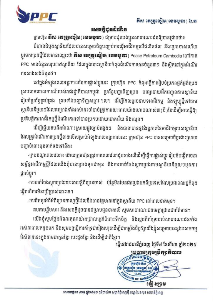 (ភ្នំពេញ)៖ ក្រុមហ៊ុន ភីស ភេត្រូលៀម (ខេមបូឌា) (Peace Petroleum Cambodia) នៅថ្ងៃទី៩ ខែសីហា ឆ្នាំ២០២៥នេះ ដែលសុទ្ធសឹងជាអតីតម្ចាស់ស្ថានីយប្រេងឥន្ធនៈ PTT បានចេញសេចក្តីជូនដំណឹងផ្លូវការ បញ្ជាក់ពីការបញ្ចប់ការធ្វើអាជីវកម្មលើផលិតផល និងប្រេនចាស់ហើយ ប្តូរមកប្រេនថ្មីដែលមានឈ្មោះថា ភីស តេត្រូលៀម(ខេមបូឌា) Peace Petroleum Cambodia ហៅកាត់ PPC។