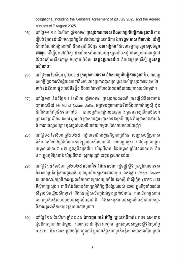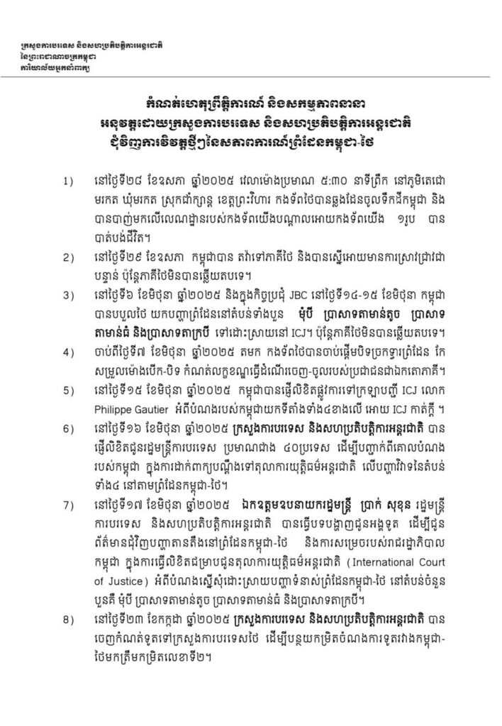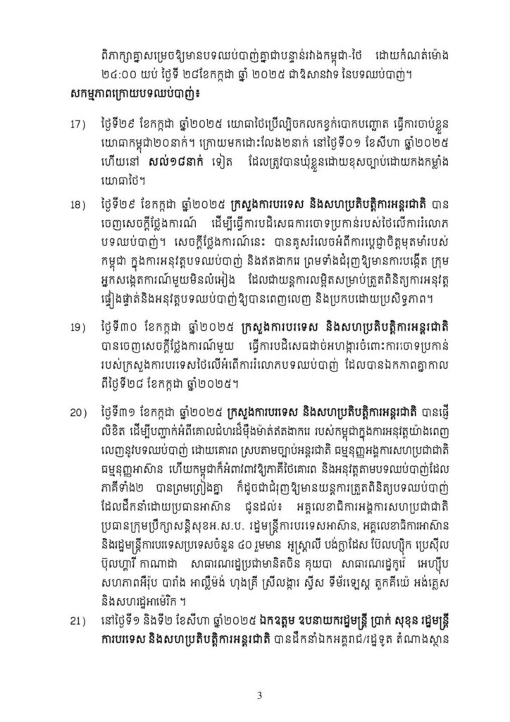 ២០. ថ្ងៃទី៣១ ខែកក្កដា ឆ្នាំ២០២៥ ក្រសួងការបរទេស និងសហប្រតិបត្តិការអន្តរជាតិ បានផ្ញើលិខិត ដើម្បីបញ្ជាក់អំពីគោលជំហរដ៏ម៉ឺងម៉ាត់ឥតងាករ របស់កម្ពុជាក្នុងការអនុវត្តយ៉ាងពេញលេញនូវបទឈប់បាញ់ ដោយគោរព ស្របតាមច្បាប់អន្តរជាតិ ធម្មនុញ្ញអង្គការសហប្រជាជាតិធម្មនុញ្ញអាស៊ាន ហើយកម្ពុជាក៏អំពាវពាវឱ្យភាគីថៃគោរព និងអនុវត្តតាមបទឈប់បាញ់ដែលភាគីទាំង២ បានព្រមព្រៀងគ្នា ក៏ដូចជាជំរុញឱ្យមានយន្តការត្រួតពិនិត្យបទឈប់បាញ់ ដែលដឹកនាំដោយប្រធានអាស៊ាន ជូនដល់៖ អគ្គលេខាធិការអង្គការសហប្រជាជាតិប្រធានក្រុមប្រឹក្សាសន្តិសុខអ.ស.ប. រដ្ឋមន្ត្រីការបរទេសអាស៊ាន, អគ្គលេខាធិការអាស៊ាន និងរដ្ឋមន្ត្រីការបរទេសប្រទេសចំនួន ៤០ រួមមាន អូស្ត្រាលី បង់ក្លាដែស ប៊ែលហ្ស៊ិក ប្រេស៊ីល ប៊ុលហ្គារី កាណាដា សាធារណរដ្ឋប្រជាមានិតចិន គុយបា សាធារណរដ្ឋកូរ៉េ អេហ្ស៊ីប សហភាពអឺរ៉ុប បារាំង អាល្លឺម៉ង់ ហុងគ្រី ស្រីលង្ការ ស្វីស ទីម័រឡេស្ត តួកគីយ៉េ អង់គ្លេស និងសហរដ្ឋអាម៉េរិក ។