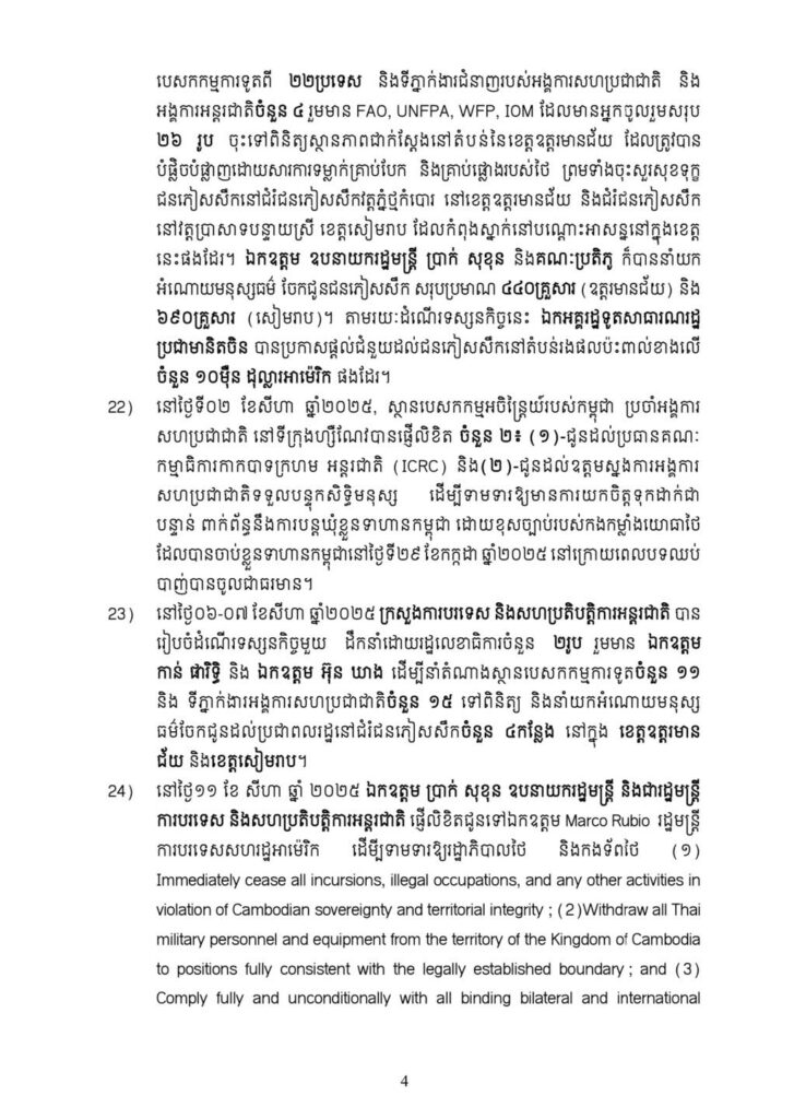 ២៤. នៅថ្ងៃ១១ ខែ សីហា ឆ្នាំ ២០២៥ ឯកឧត្ដម ប្រាក់ សុខុន ឧបនាយករដ្ឋមន្ត្រី និងជារដ្ឋមន្ត្រីការបរទេស និងសហប្រតិបត្តិការអន្តរជាតិ ផ្ញើលិខិតជូនទៅឯកឧត្តម Marco Rubio រដ្ឋមន្ត្រីការបរទេសសហរដ្ឋអាម៉េរិក ដើម្បីទាមទារឱ្យរដ្ឋាភិបាលថ និងកងទ័ពថ (១) Immediately cease all incursions, illegal occupations, and any other activities inviolation of Cambodian sovereignty and territorial integrity; (2)Withdraw all Thai military personnel and equipment from the territory of the Kingdom of Cambodia to positions fully consistent with the legally established boundary; and (3) Comply fully and unconditionally with all binding bilateral and international obligations, including the Ceasefire Agreement of 28 July 2025 and the Agreed Minutes of 7 August 2025.