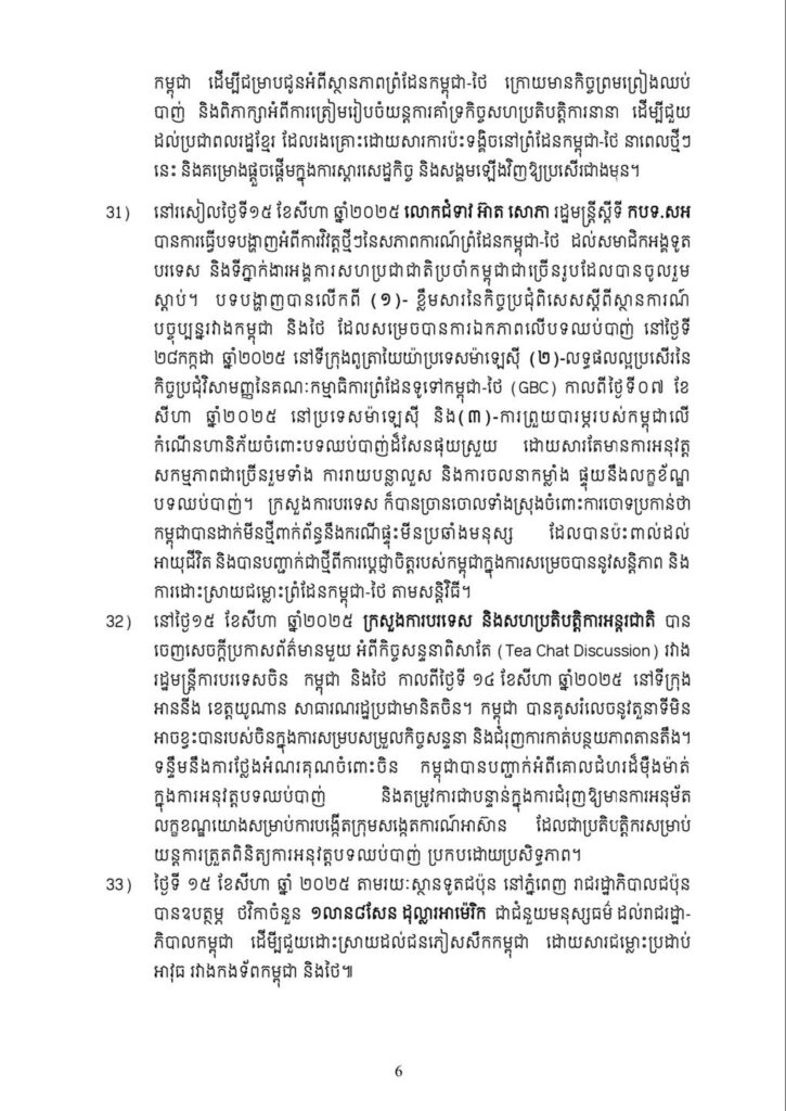 ៣១. នៅរសៀលថ្ងៃទី១៥ ខែសីហា ឆ្នាំ២០២៥ លោកជំទាវ អ៊ាត សោភា រដ្ឋមន្ត្រីស្តីទី កបទ.សអ បានការធ្វើបទបង្ហាញអំពីការវិវត្តថ្មីៗនៃសភាពការណ៍ព្រំដែនកម្ពុជា-ថៃ ដល់សមាជិកអង្គទូតបរទេស និងទីភ្នាក់ងារអង្គការសហប្រជាជាតិប្រចាំកម្ពុជាជាច្រើនរូបដែលបានចូលរួមស្តាប់។ បទបង្ហាញបានលើកពី (១)- ខ្លឹមសារនៃកិច្ចប្រជុំពិសេសស្ដីពីស្ថានការណ៍បច្ចុប្បន្នរវាងកម្ពុជា និងថៃ ដែលសម្រេចបានការឯកភាពលើបទឈប់បាញ់ នៅថ្ងៃទី២៨កក្កដា ឆ្នាំ២០២៥ នៅទីក្រុងពូត្រាយយ៉ាប្រទេសម៉ាឡេស៊ី (២)-លទ្ធផលល្អប្រសើរនកិច្ចប្រជុំវិសាមញ្ញនៃគណៈកម្មាធិការព្រំដែនទូទៅកម្ពុជា-ថៃ (GBC) កាលពីថ្ងៃទី០៧ ខែសីហា ឆ្នាំ២០២៥ នៅ ប្រទេសម៉ាឡេស៊ី និង(៣)-ការព្រួយបារម្ភរបស់កម្ពុជាលើកំណើនហានិភ័យចំពោះបទឈប់បាញ់ដ៏សែនផុយស្រួយ ដោយសារតែមានការអនុវត្តសកម្មភាពជាច្រើនរួមទាំង ការរាយបន្លាលួស និងការចលនាកម្លាំង ផ្ទុយនឹងលក្ខខ័ណ្ឌបទឈប់បាញ់។ ក្រសួងការបរទេស ក៏បានច្រានចោលទាំងស្រុងចំពោះការចោទប្រកាន់ថា កម្ពុជាបានដាក់មីនថ្មីពាក់ព័ន្ធនឹងករណីផ្ទុះមីនប្រឆាំងមនុស្ស ដែលបានប៉ះពាល់ដល់អាយុជីវិត និងបានបញ្ជាក់ជាថ្មីពីការប្ដេជ្ញាចិត្តរបស់កម្ពុជាក្នុងការសម្រេចបាននូវសន្តិភាព និងការដោះស្រាយជម្លោះព្រំដែនកម្ពុជា-ថៃ តាមសន្តិវិធី។
