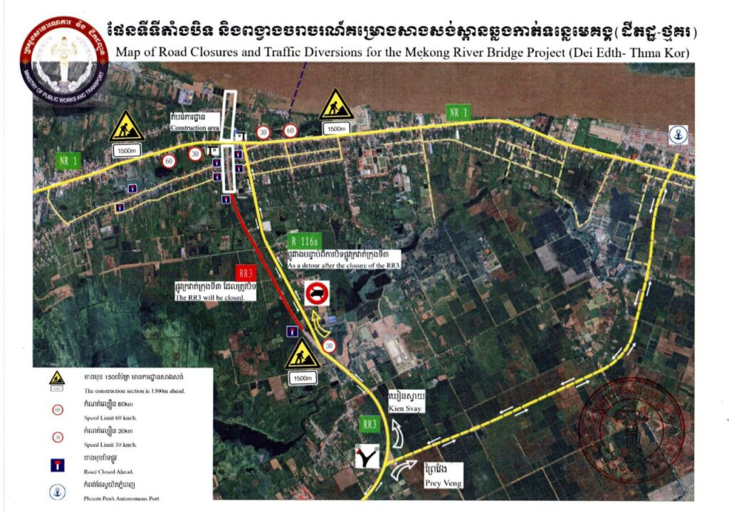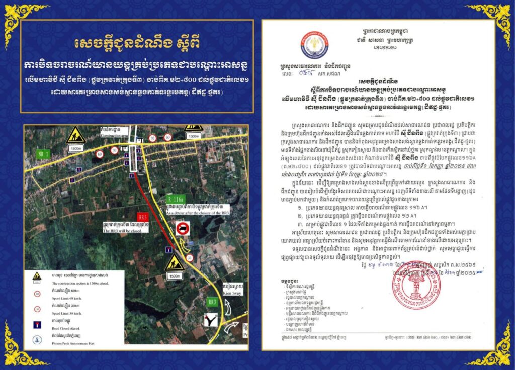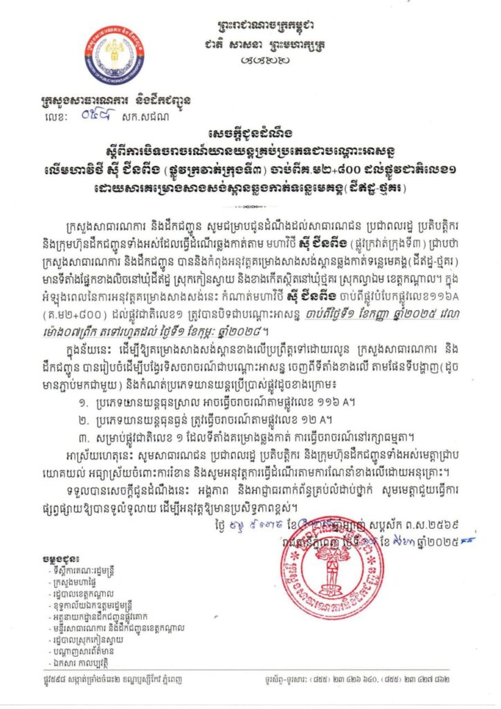 (ភ្នំពេញ)៖ ក្រសួងសាធារណការ និងដឹកជញ្ជូន ប្រកាសការបិទចរាចរណ៍យានយន្តគ្រប់ប្រភេទជាបណ្តោះអាសន្នលើមហាវិថី ស៊ី ជីនពីង (ផ្លូវក្រវាត់ក្រុងទី៣) ចាប់ពី គ.ម ២+៨០០ ដល់ផ្លូវជាតិលេខ១ ចាប់ពីថ្ងៃទី១ ខែកញ្ញា ឆ្នាំ២០២៥ វេលាម៉ោង០៧ព្រឹក តទៅរហូតដល់ ថ្ងៃទី១ ខែកុម្ភៈ ឆ្នាំ២០២៨ ដើម្បីអនុវត្តគម្រោងសាងសង់ស្ពានឆ្លងកាត់ទន្លេមេគង្គ (ដីឥដ្ឋ-ថ្មគរ) ដែលមានទីតាំងផ្នែកខាងលិច នៅឃុំដីឥដ្ឋ ស្រុកកៀនស្វាយ និងខាងកើតស្ថិតនៅឃុំថ្មគរ ស្រុកល្វាឯម ខេត្តកណ្តាល។