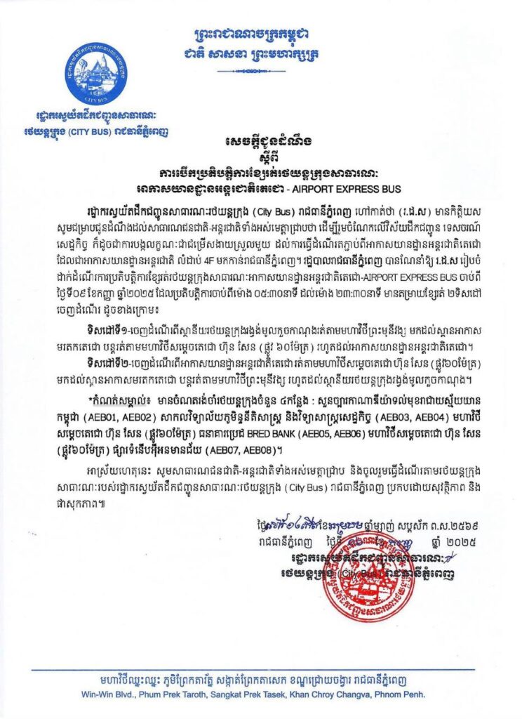 រដ្ឋបាលរាជធានីភ្នំពេញ បានណែនាំឱ្យ រ.ដ.ស រៀបចំ ដាក់ដំណើរការប្រតិបត្តិការខ្សែរត់រថយន្តក្រុងសាធារណៈអាកាសយានដ្ឋានអន្តរជាតិតេជោ-AIRPORT EXPRESS BUS ចាប់ពី ថ្ងៃទី០៩ ខែកញ្ញា ឆ្នាំ២០២៥ ដែលប្រតិបត្តិការចាប់ពីម៉ោង ០៥៖៣០នាទី ដល់ម៉ោង២៣៖៣០នាទី មានតម្រាយខ្សែរត់ ២ទិសដៅ ចេញដំណើរ ដូចខាងក្រោម៖