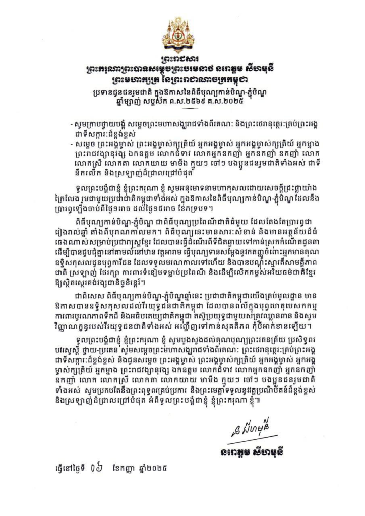 ព្រះមហាក្សត្រ ចេញព្រះរាជសារជូនជនរួមជាតិ ក្នុងឱកាស​នៃពិធីបុណ្យកាន់បិណ្ឌ-ភ្ជុំបិណ្ឌ