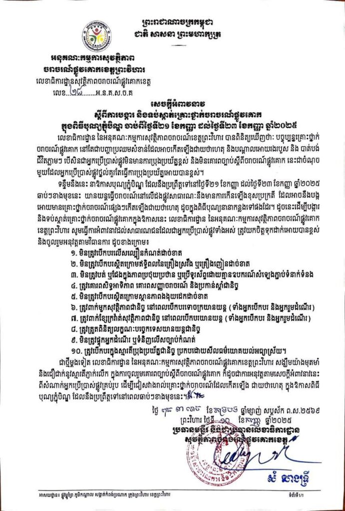 (ព្រះវិហារ)៖ អនុគណៈកម្មការសុវត្ថិភាពចរាចរណ៍ផ្លូវគោកខេត្តព្រះវិហារ បានចេញសេចក្តីអំពាវនាវចំនួន១០ចំណុច ស្តីពីការបង្ការ និងទប់ស្កាត់គ្រោះថ្នាក់ចរាចរណ៍ផ្លូវគោក ក្នុងពិធីបុណ្យភ្ជុំបិណ្ឌ ចាប់ពីថ្ងៃទី២១-២៣ ខែកញ្ញា ឆ្នាំ២០២៥។