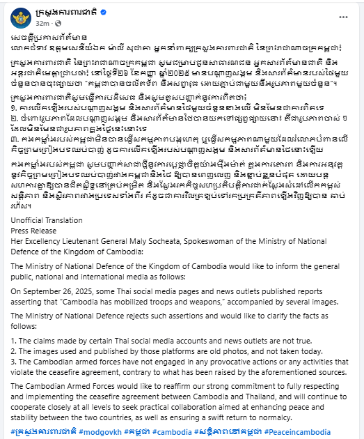 (ភ្នំពេញ)៖ លោកស្រីឧត្តមសេនីយ៍ឯក ម៉ាលី សុជាតា អ្នកនាំពាក្យក្រសួងការពារជាតិ នៅព្រឹកថ្ងៃទី២៦ ខែកញ្ញា ឆ្នាំ២០២៥នេះ បានចេញមកទាត់ចោលទាំងស្រុង ចំពោះការចោទប្រកាន់របស់ភាគីថៃ និងសារព័ត៌មានរបស់ថៃថា «កម្ពុជាបានចល័តទ័ព និងសព្វាវុធ»។ ផ្ទុយទៅវិញ កម្ពុជាមិនបានធ្វើសកម្មភាពបង្កហេតុ ឬធ្វើសកម្មភាពណាមួយរំលោភបំពានលើកិច្ចព្រមព្រៀងបទឈប់បាញ់នោះឡើយ។