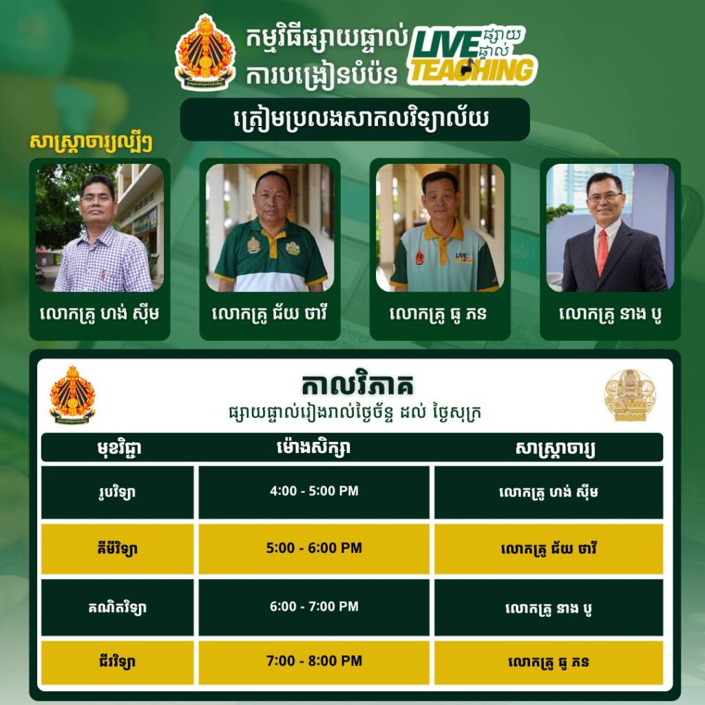 លោកបណ្ឌិត សាន វឌ្ឍនា បានបញ្ជាក់ថា កម្មវិធីបង្រៀនតាមប្រព័ន្ធសមកាលកម្ម ឬការបង្រៀនដោយការផ្សាយបន្តផ្ទាល់ (Live Teaching) នឹងមានជារៀងរាល់ថ្ងៃច័ន្ទដល់ថ្ងៃសុក្រ លើមុខវិជ្ជាដូចខាងក្រោម៖