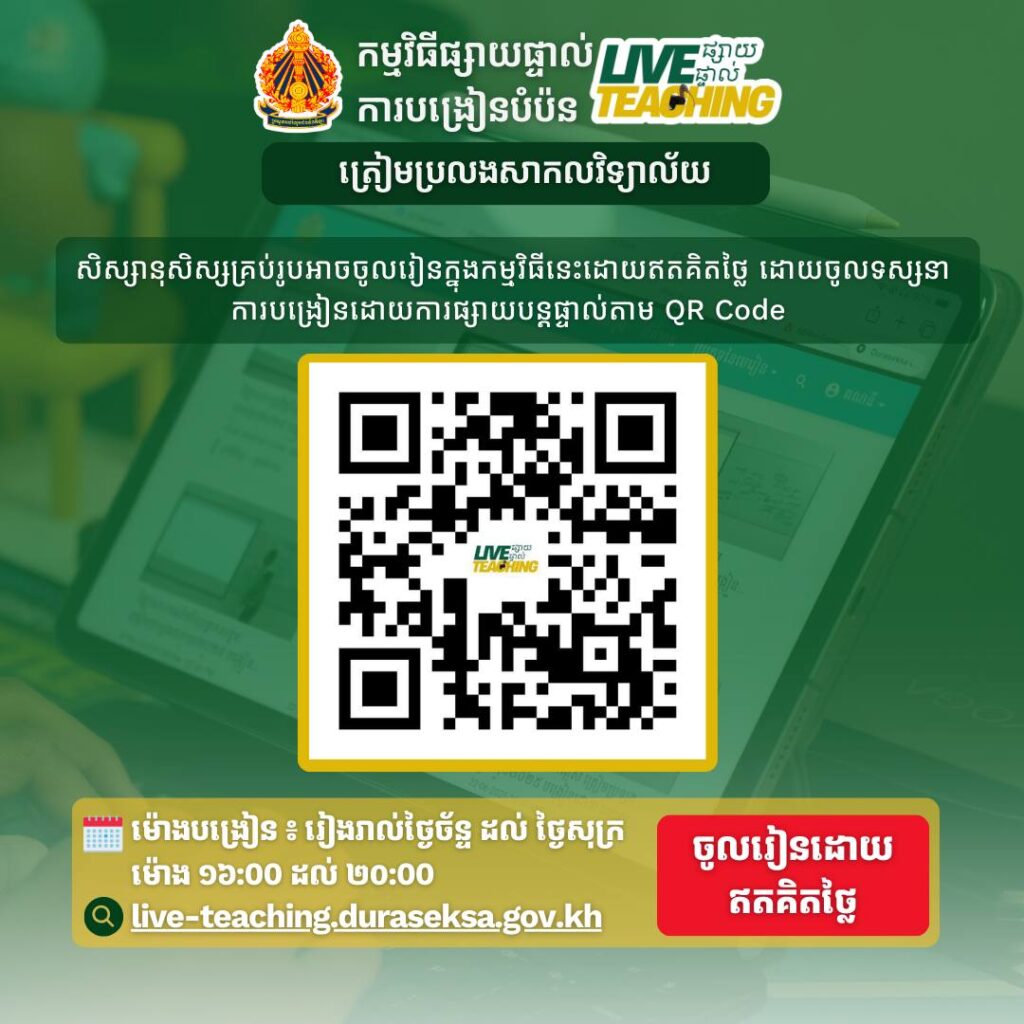 សិស្សានុសិស្សគ្រប់រូបអាចចូលរៀនក្នុងកម្មវិធីនេះដោយឥតគិតថ្លៃ ដោយចូលទស្សនាការបង្រៀនដោយការផ្សាយបន្តផ្ទាល់តាម https://live-teaching.duraseksa.gov.kh (https://live-teaching.duraseksa.gov.kh/) ឬស្កេនលើ QR Code។ ក្នុងអំឡុងពេលនៃការរៀនសិស្សដែលមានចម្ងល់អាចសាកសួរដោយផ្ទាល់ទៅកាន់សាស្រ្តាចារ្យ ហើយចម្ងល់ទាំងនោះនឹងទទួលបានការស្រាយបំភ្លឺតបជូនទៅកាន់សិស្សានុសិស្សវិញ។ ក្រៅពីការបង្រៀនដោយការផ្សាយបន្តផ្ទាល់ពីសំណាក់សាស្រ្តាចារ្យទាំង ៤រូប មជ្ឈមណ្ឌលសម្រាប់ការអប់រំឌីជីថល និងការអប់រំពីចម្ងាយក៏នឹងអញ្ជើញនិស្សិតឆ្នាំទី១នៃសាកលវិទ្យាល័យ ដែលទើបប្រឡងចូលរៀនដោយជោគជ័យកាលពីឆ្នាំមុន មកចែករំលែកបទពិសោធន៍ស្តីពីការប្រឡង និងការត្រៀមខ្លួនដើម្បីប្រឡងឱ្យបានជោគជ័យ។