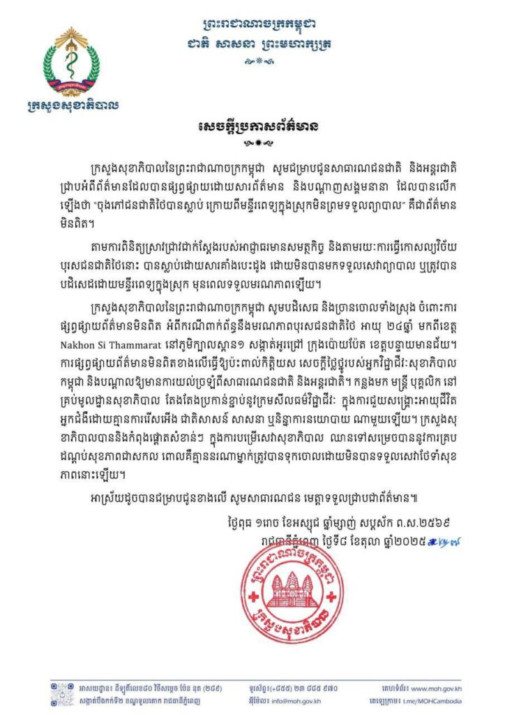 ក្រសួងសុខាភិបាល សូមបដិសេធ និងច្រានចោលទាំងស្រុង ចំពោះការ ផ្សព្វផ្សាយព័ត៌មានមិនពិត អំពីករណីពាក់ព័ន្ធនឹងមរណភាពបុរសជនជាតិថៃ អាយុ២៤ឆ្នាំ មកពីខេត្ត Nakhon Si Thammarat នៅភូមិក្បាលស្ពាន១ សង្កាត់អូរជ្រៅ ក្រុងប៉ោយប៉ែត ខេត្តបន្ទាយមានជ័យ។