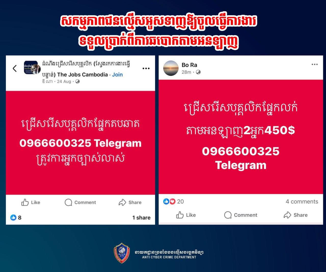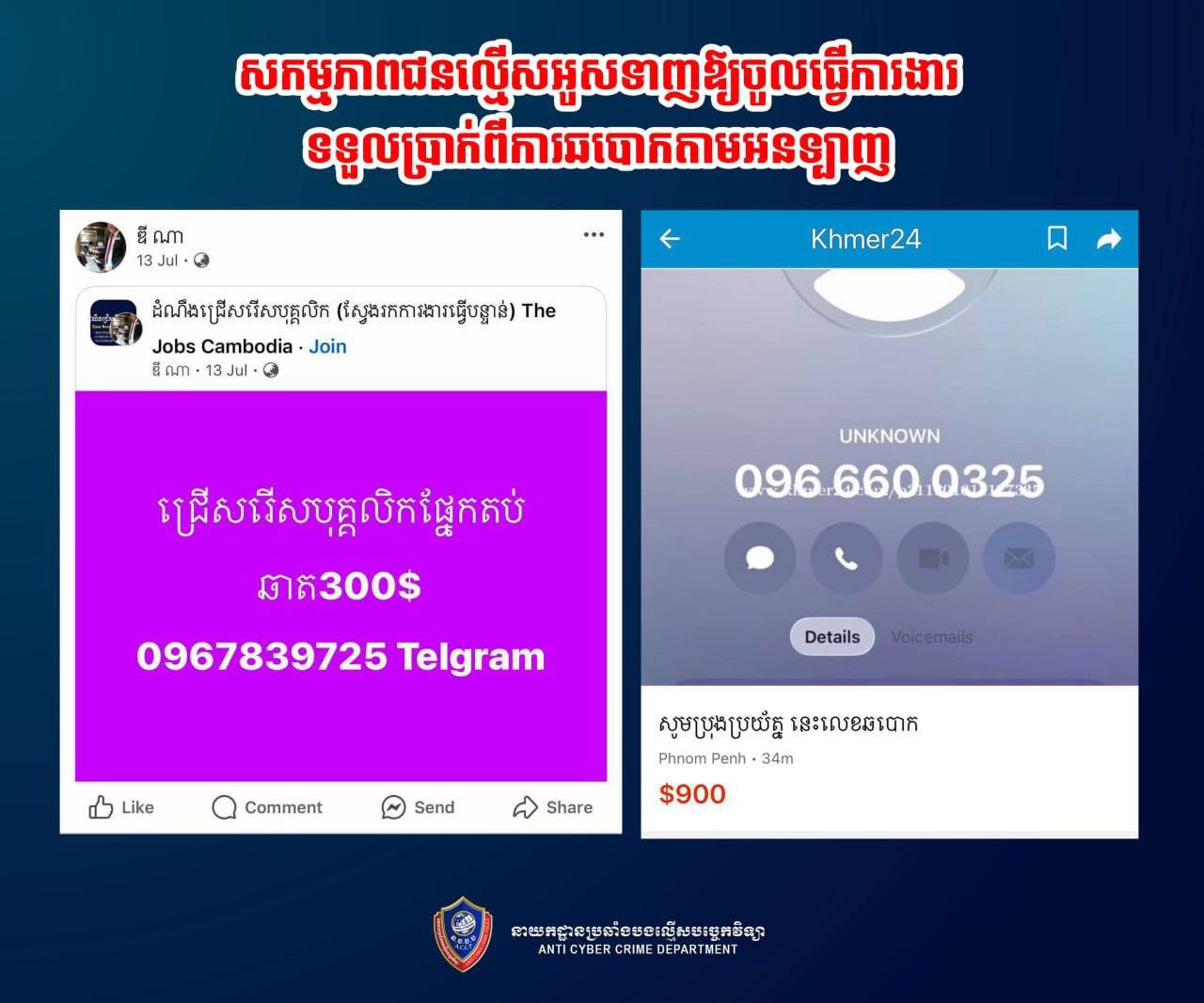 ក្នុងនោះ ដែលគណនីហ្វេសប៊ុករបស់ជនអនាមិក នៅតែបន្ដបង្ហោះផ្សព្វផ្សាយទិញ-លក់ទូរស័ព្ទ និងស្វែងរកអ្នកចូលរួមធ្វើសកម្មភាពទទួលប្រាក់ និងតបឆាត តាមរយៈលេខទូរស័ព្ទ ០៩៦ ៦៦០ ០៣២៥, ០៩៦ ៧៨៣ ៩៧២៥ និងបានឱ្យ QR Code របស់គណនីធនាគារផ្សេងៗ តាមបណ្ដាញសង្គមនានា ក្នុងគោលបំណងជ្រើរើសបុគ្គលិកសម្រាប់ការងារ។