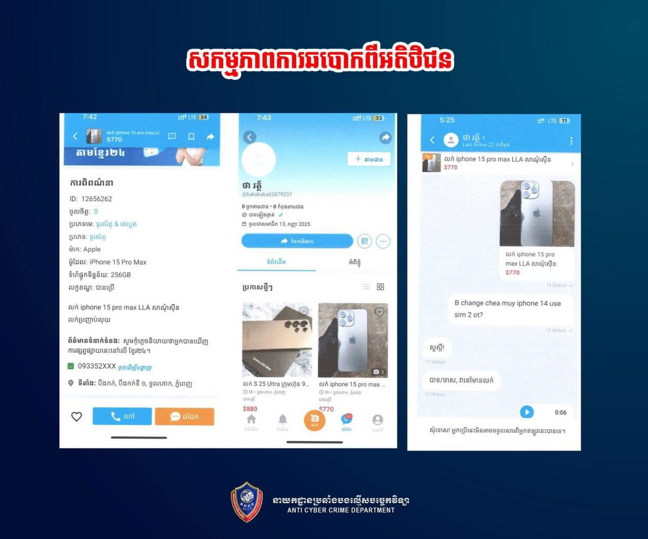 (ភ្នំពេញ)៖ នាយកដ្ឋានប្រឆាំងបទល្មើសបច្ចេកវិទ្យា បានបើកការស្រាវជ្រាវ និងបង្រ្កាបលើករណីឆបោកប្រាក់ក្រោមរូបភាពទិញ-លក់ទូរស័ព្ទតាមអនឡាញ ដែលមានជនរងគ្រោះជាច្រើននាក់ ដែលបានដាក់ពាក្យបណ្ដឹង។