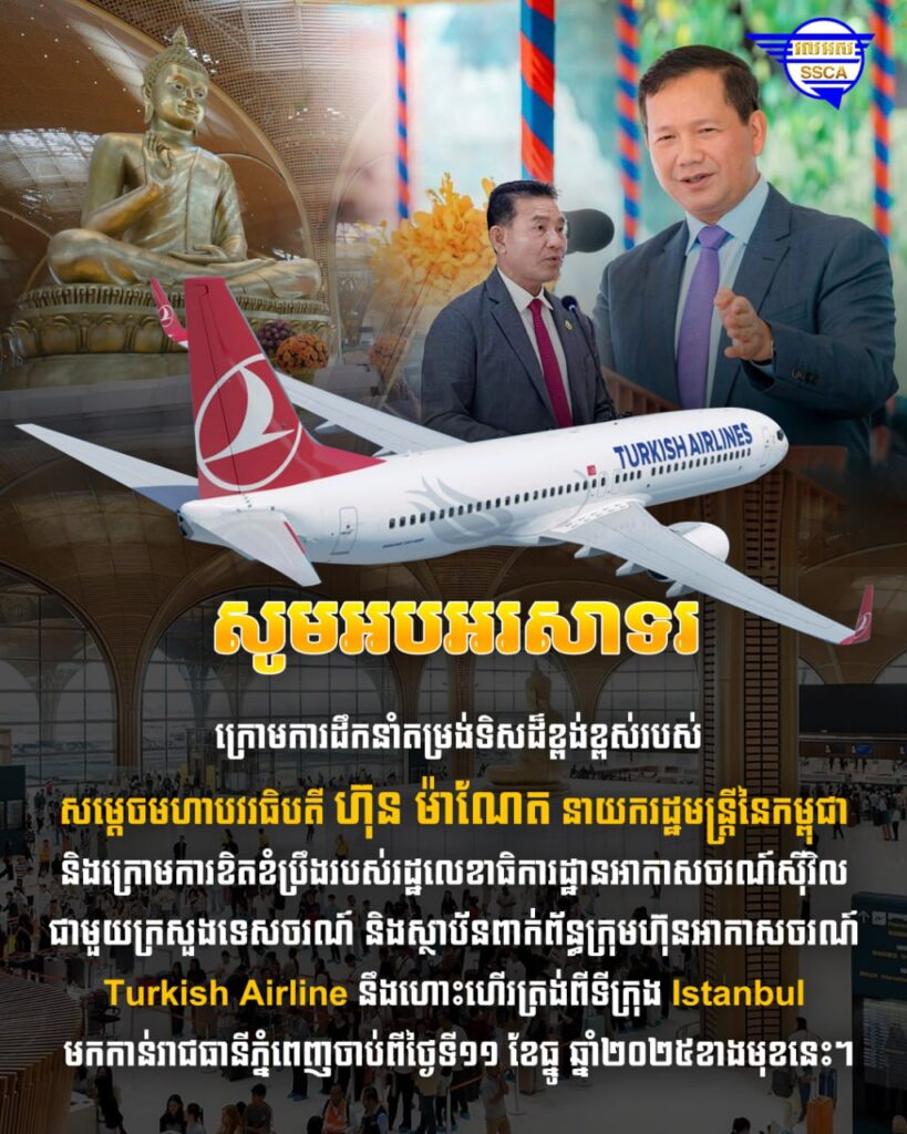 (ភ្នំពេញ)៖ ក្រុមហ៊ុនអាកាសចរណ៍ Turkish Airline នឹងចាប់ផ្តើមបើកការហោះហើរត្រង់ពីទីក្រុង Istanbul មកកាន់រាជធានីភ្នំពេញ ចាប់ពីថ្ងៃទី១១ ខែធ្នូ ឆ្នាំ២០២៥ខាងមុខនេះ បន្ទាប់មើលឃើញពីសក្តានុពលទេសចរណ៍ដ៏ខ្លាំងក្លាដែលជាទីផ្សារទើបនឹងរះភ្លឺចែងចាំងក្រោមម្លប់សុខសន្តិភាព។ នេះបើតាមមន្រ្តីជាន់ខ្ពស់នៃអាកាសចរណ៍ស៊ីវិល។