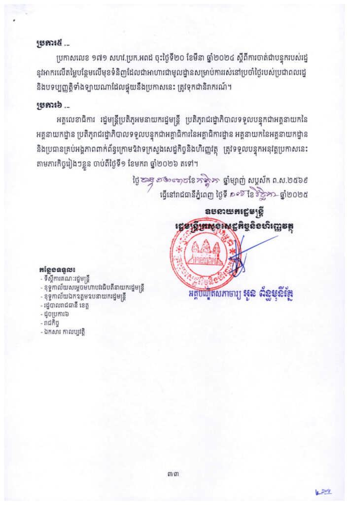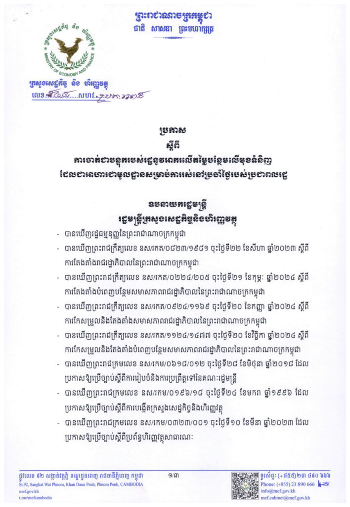 (ភ្នំពេញ)៖ ក្រសួងសេដ្ឋកិច្ច និងហិរញ្ញវត្ថុ ដែលជាសេនាធិការរបស់រាជរដ្ឋាភិបាលកម្ពុជា បានចេញប្រកាសថ្មីមួយ ដោយបន្តអនុគ្រោះអាការលើតម្លៃបន្ថែមលើមុខទំនិញ ដែលជាអាហារជាមូលដ្ឋានសម្រាប់ការរស់នៅប្រចាំថ្ងៃរបស់ប្រជាពលរដ្ឋ តាមរយៈការដាក់អាករនេះជាបន្ទុករបស់រដ្ឋ។ នេះបើតាមប្រកាសថ្មីមួយរបស់ក្រសួងសេដ្ឋកិច្ច ដែលបណ្តាញព័ត៌មាន Fresh News ទទួលបាននៅព្រឹកថ្ងៃទី១ ខែធ្នូ ឆ្នាំ២០២៥នេះ។