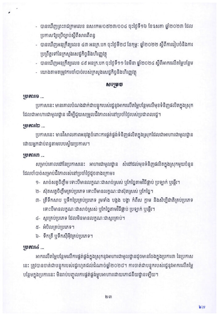 រាជរដ្ឋាភិបាល បន្តអនុគ្រោះអាករលើតម្លៃបន្ថែមលើមុខទំនិញ ដែលជាអាហារមូលដ្ឋានសម្រាប់ការរស់នៅប្រចាំថ្ងៃរបស់ប្រជាពលរដ្ឋ