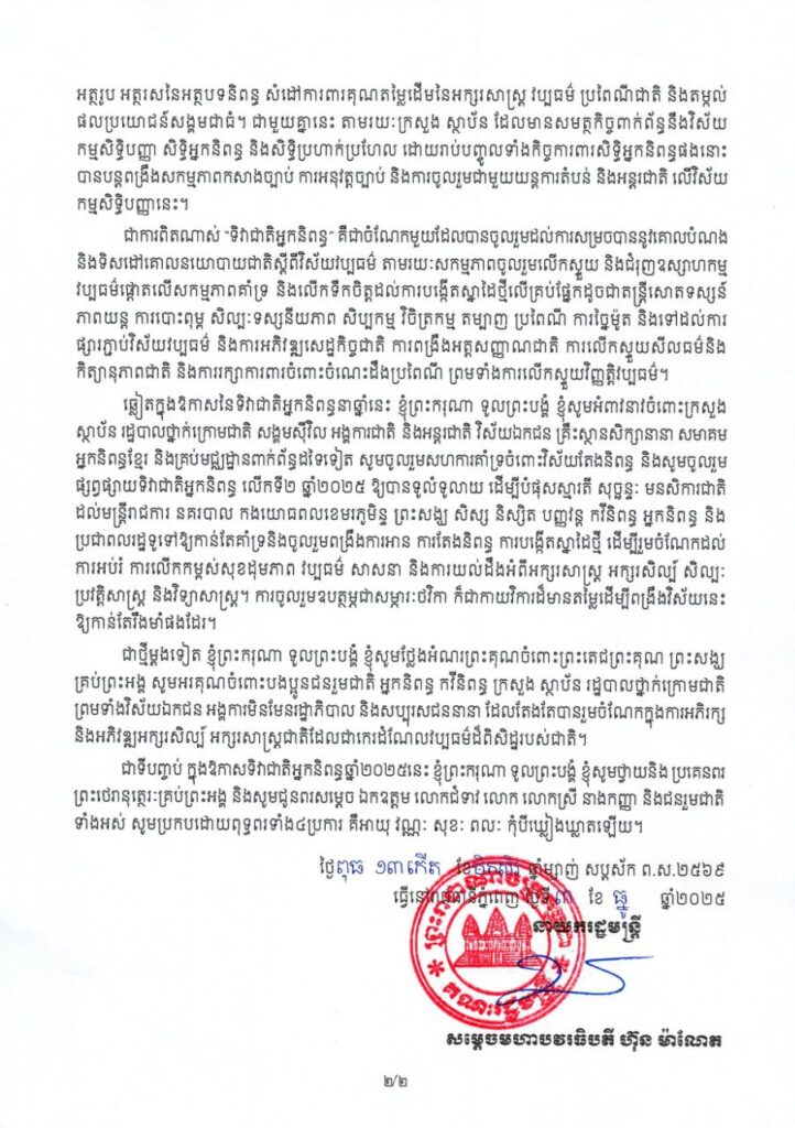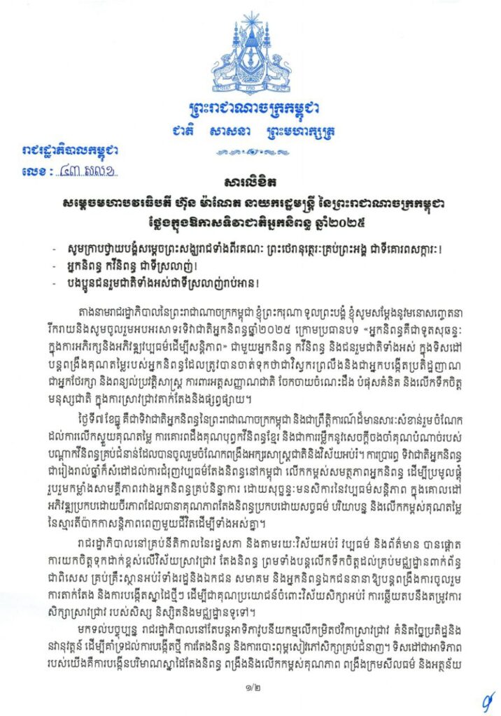 សម្តេចបវរធិបតី ហ៊ុន ម៉ាណែត អបអរសាទរ ទិវាជាតិអ្នកនិពន្ធ ឆ្នាំ២០២៥ ក្រោមប្រធានបទ «អ្នកនិពន្ធគឺជាទូតសុឆន្ទៈ ក្នុងការអភិរក្សនិងអភិវឌ្ឍវប្បធម៌ដើម្បីសន្តិភាព»