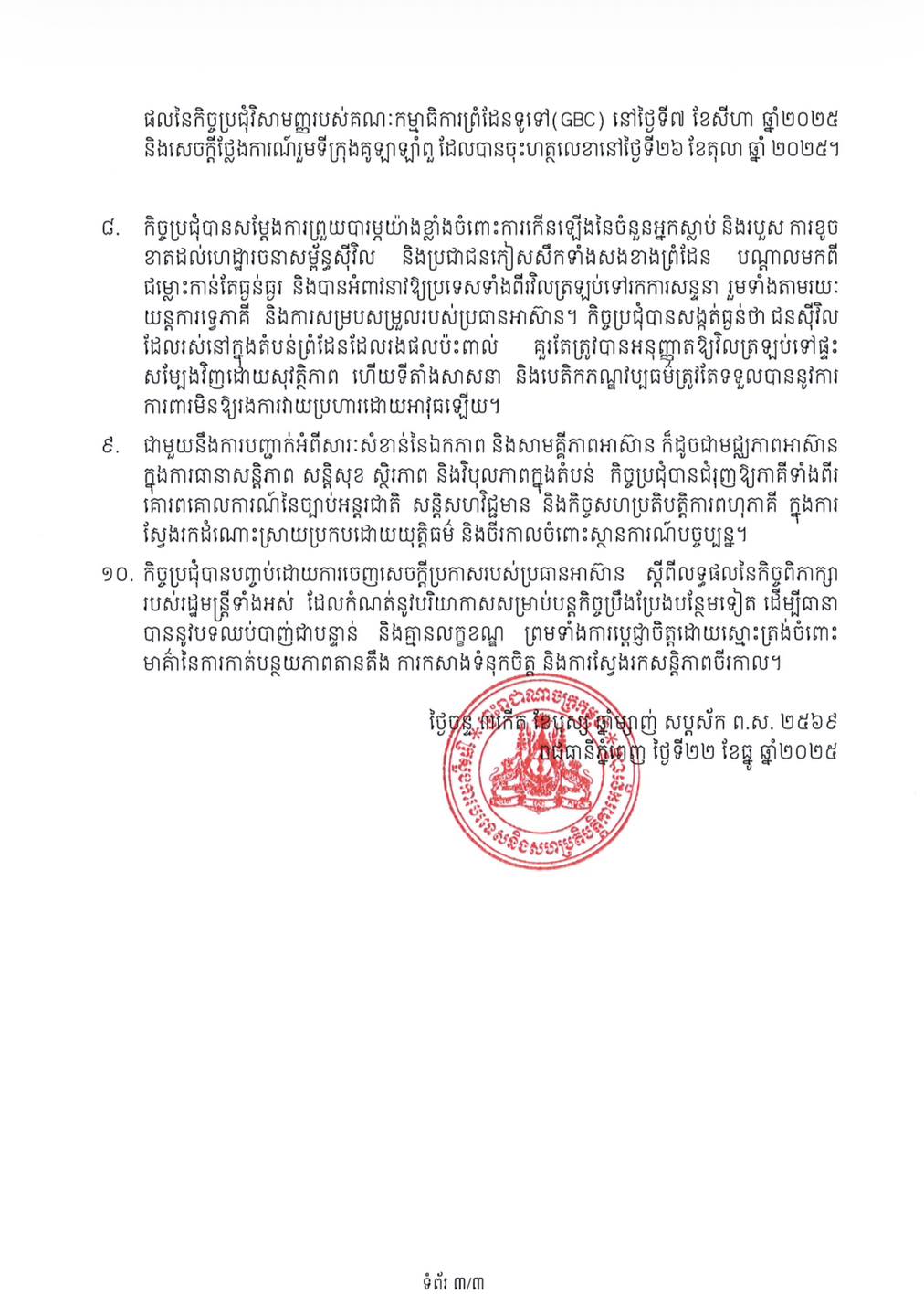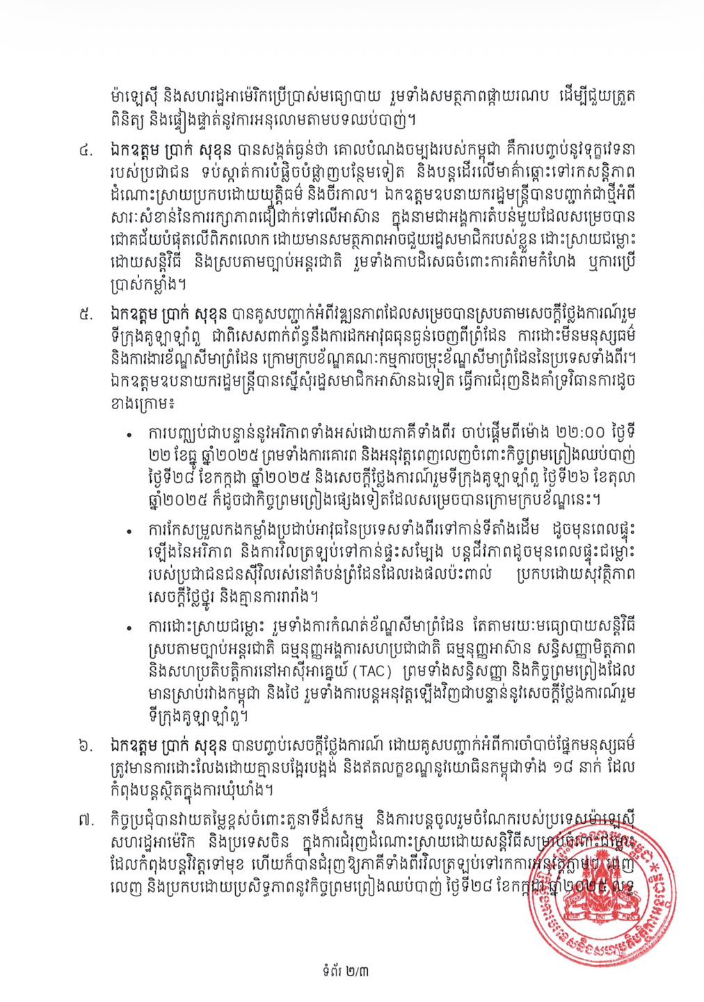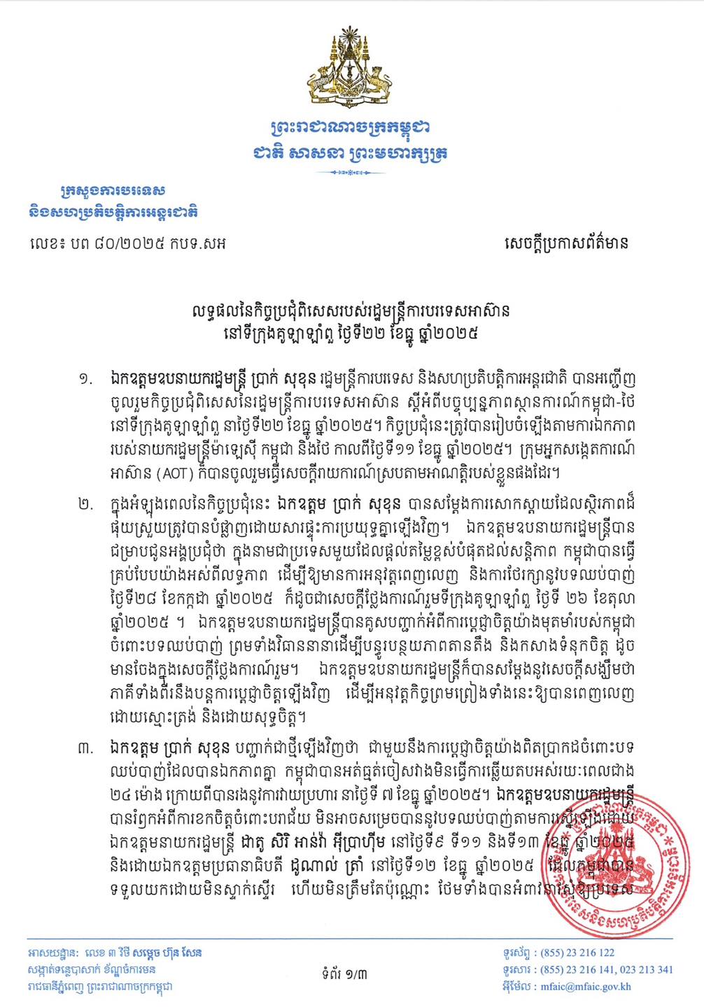 លោកបានថ្លែងបែបនេះ ក្នុងសន្និសីទព័ត៌មានមួយ បន្ទាប់ពីដឹកនាំគណៈប្រតិភូចូលរួមកិច្ចប្រជុំពិសេសរដ្ឋមន្ត្រីការបរទេសអាស៊ាន នៅប្រទេសម៉ាឡេស៉ី នាថ្ងៃទី២២ ខែធ្នូ ឆ្នាំ២០២៥។