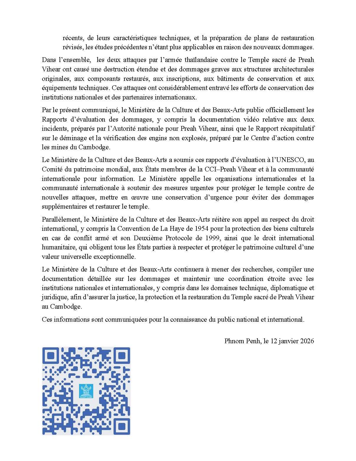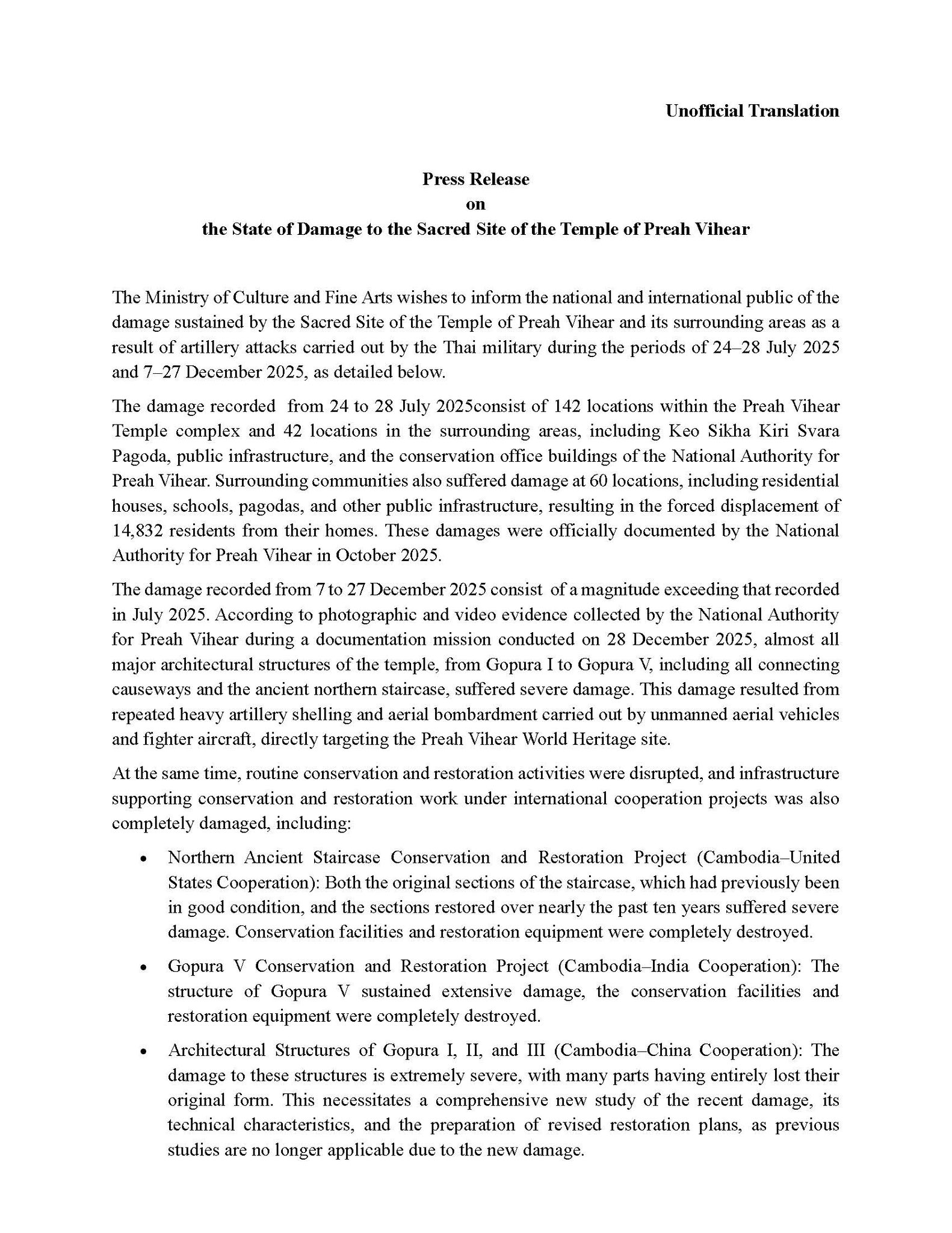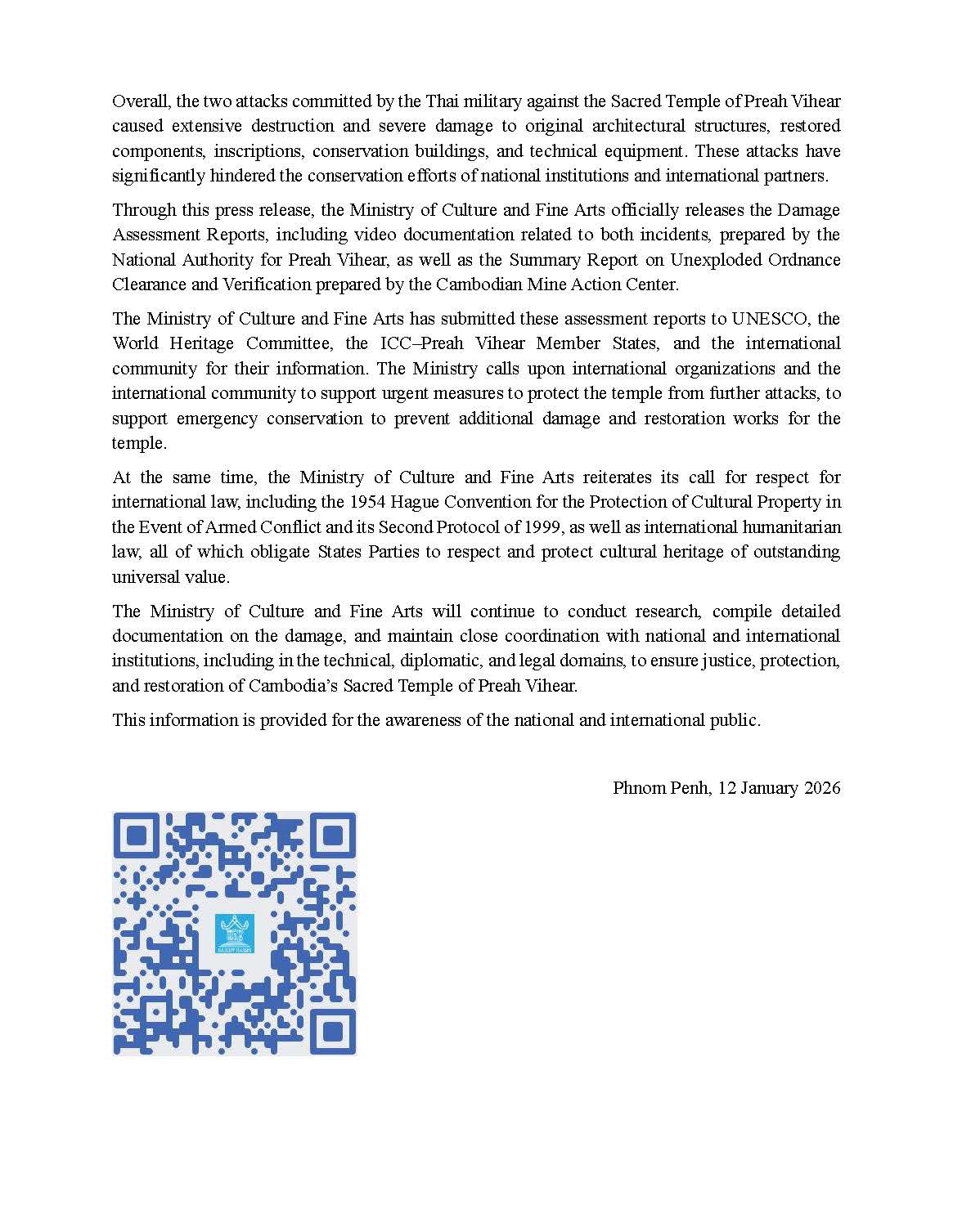 ក្រសួងវប្បធម៌ និងវិចត្រសិល្បៈ នាថ្ងៃទី១២ ខែមករា ឆ្នាំ២០២៦ នេះ បានចេញសេចក្ដីប្រកាសព័ត៌មាន ស្ដីពីស្ថានភាពខូចខាតនៅរមណីយដ្ឋានប្រាសាទព្រះវិហារ ជាទីសក្ការៈ។