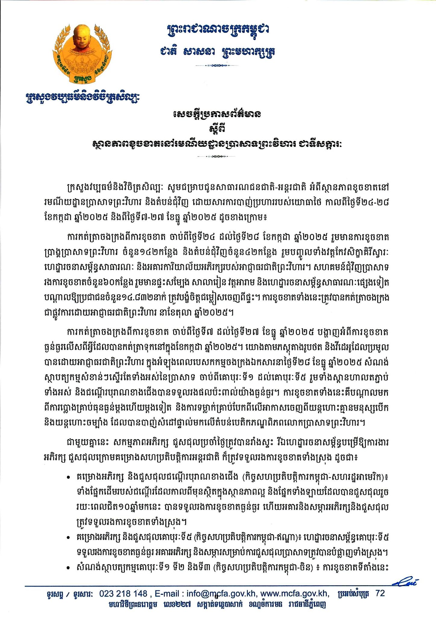 ក្រសួងវប្បធម៌និងវិចិត្រសិល្បៈ សូមជម្រាបជូនសាធារណជនជាតិ-អន្តរជាតិ អំពីស្ថានភាពខូចខាតនៅរមណីយដ្ឋានប្រាសាទព្រះវិហារ និងតំបន់ជុំវិញ ដោយសារការបាញ់ប្រហាររបស់យោធាថៃ កាលពីថ្ងៃទី២៤-២៨ ខែកក្កដាឆ្នាំ២០២៥ និងពីថ្ងៃទី៧-២៧ ខែធ្នូ ឆ្នាំ២០២៥ ដែលមាននៅក្នុងសេចក្ដីប្រកាសលម្អិតខាងក្រោមនេះ៖