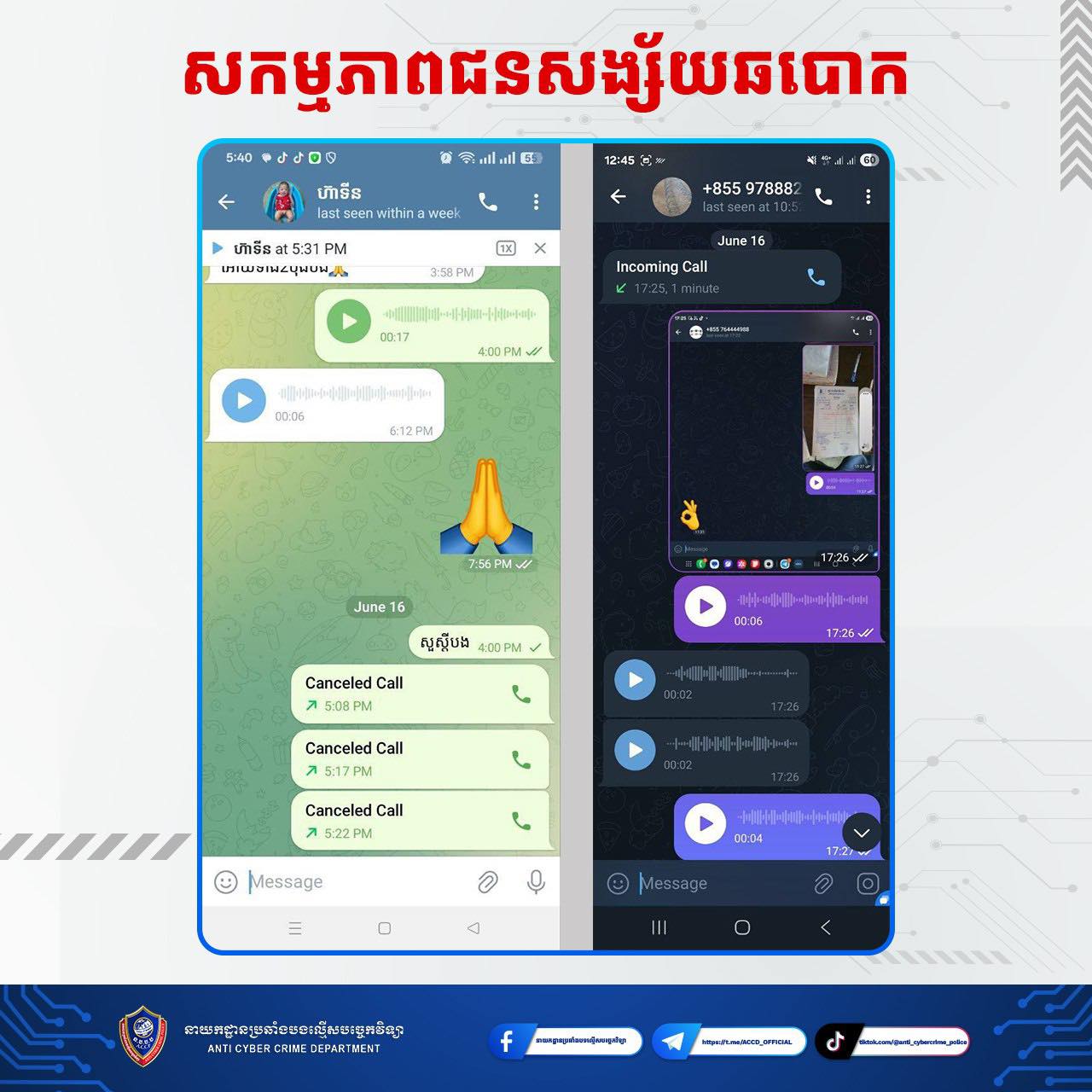 យោងតាមការចុះផ្សាយរបស់ នាយកដ្ឋានប្រឆាំងបទល្មើសបច្ចេកវិទ្យា Anti Cyber Crime Department បានឱ្យដឹងថា នាយកដ្ឋានប្រឆាំងបទល្មើសបច្ចេកវិទ្យា បង្រ្កាបករណី ជនអនាមិកបន្លំលួចគ្រប់គ្រង និងប្រើប្រាស់ គណនីបណ្ដាញសង្គម តេឡេក្រាម បោកបញ្ឆោតជនរងគ្រោះ ក្រោមរូបភាពបន្លំជាអ្នករកស៊ីជាមួយគ្នា។